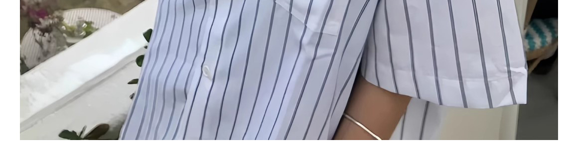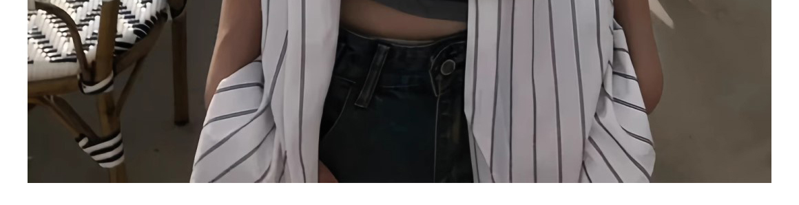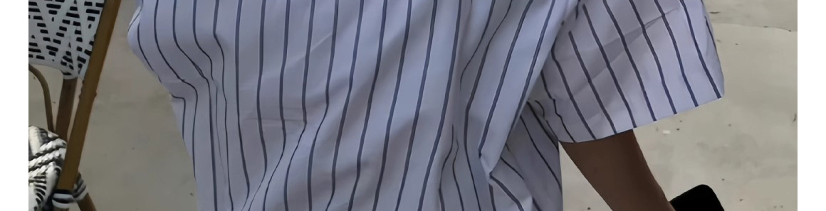 - Top: Loose-fitting striped short sleeve shirt with casual open-front design and lightweight summer fabric.
