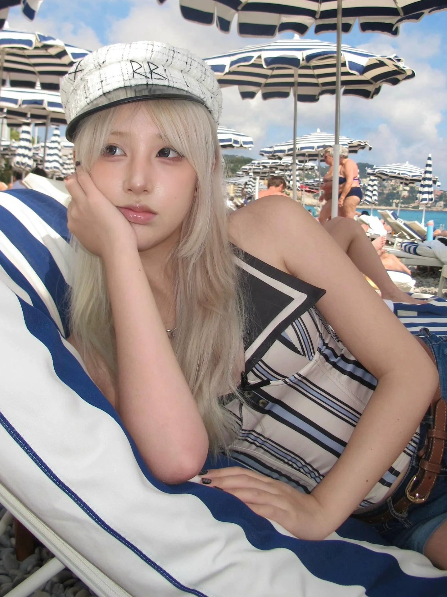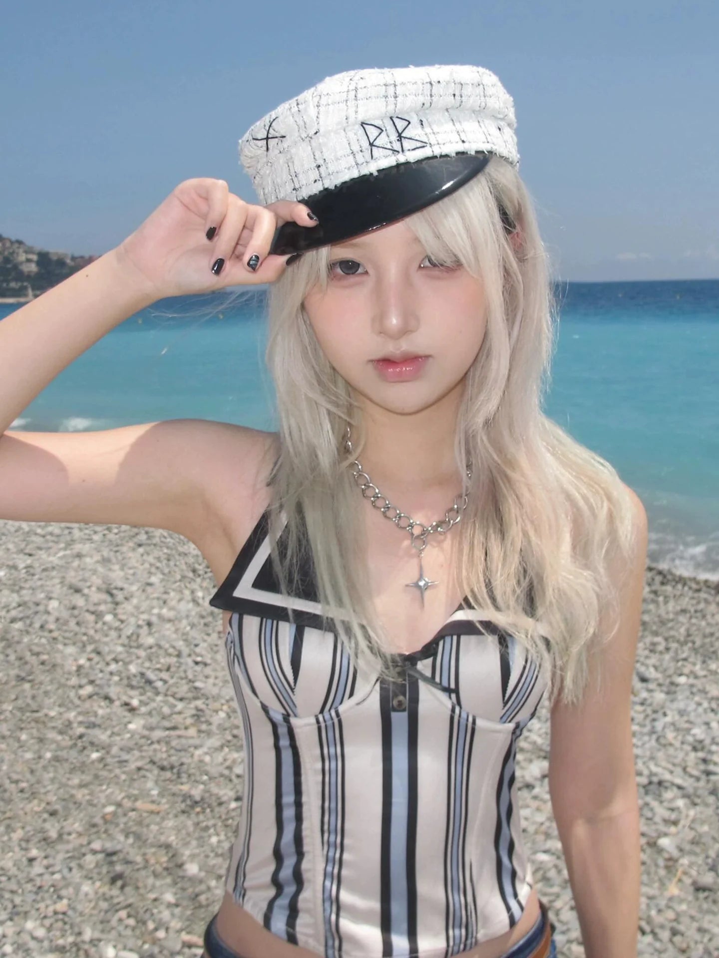- Top: Summer halter neck bustier with striped pattern, fitted waist, ribbed fishbone texture, soft cotton blend, retro Y2K sailor vibe.