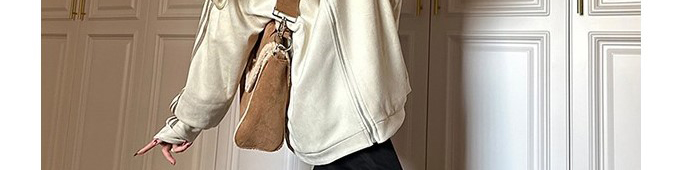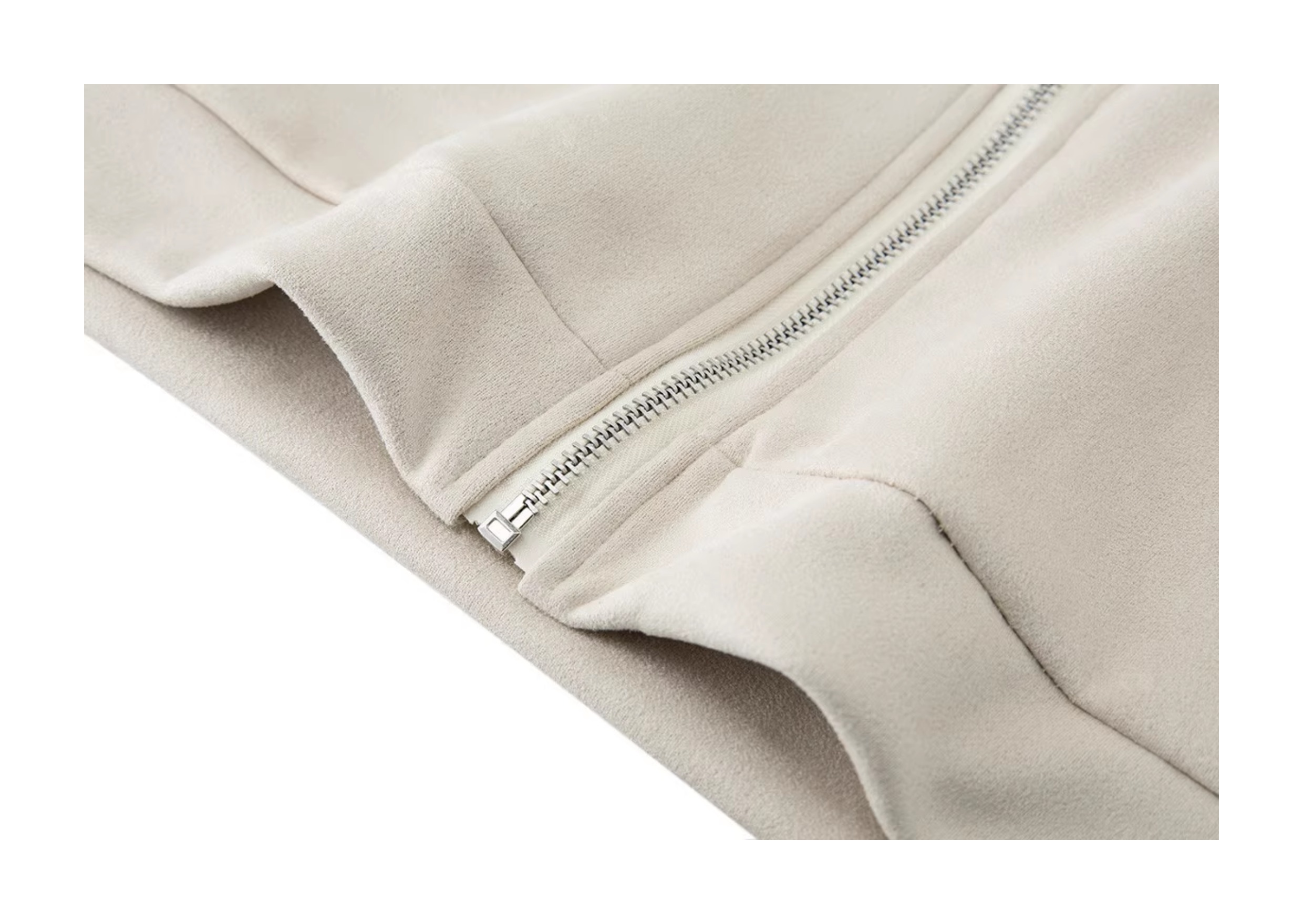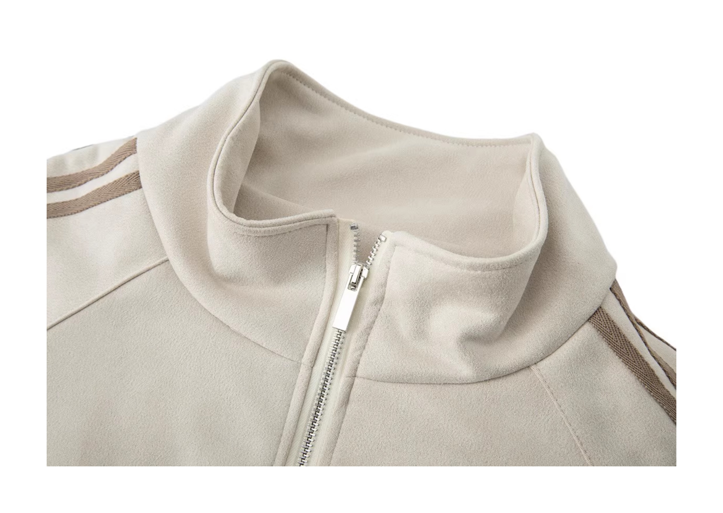 Trendy suede-textured bomber jacket with casual athletic vibes. Relaxed unisex design perfect for couples and fall layering.