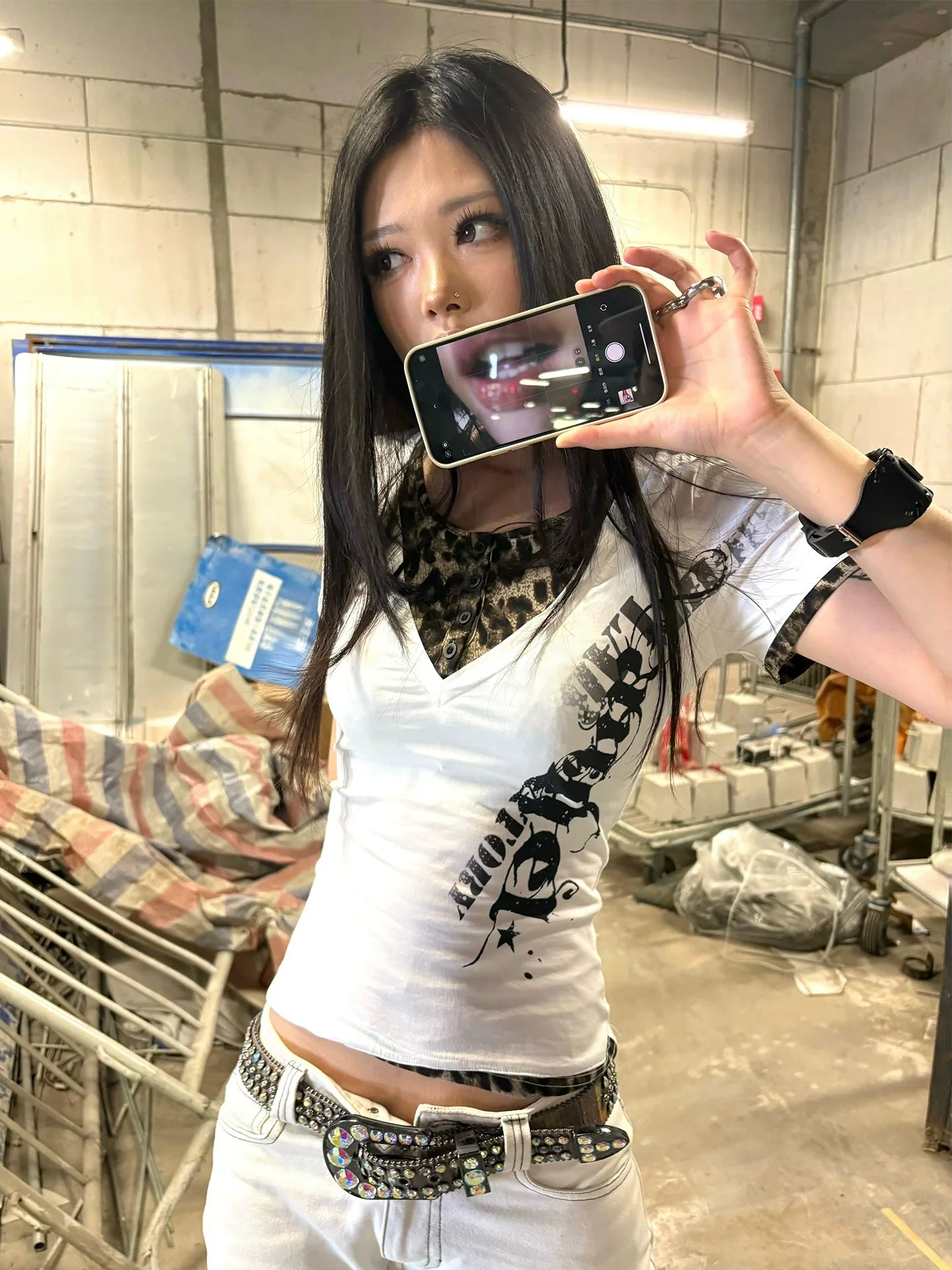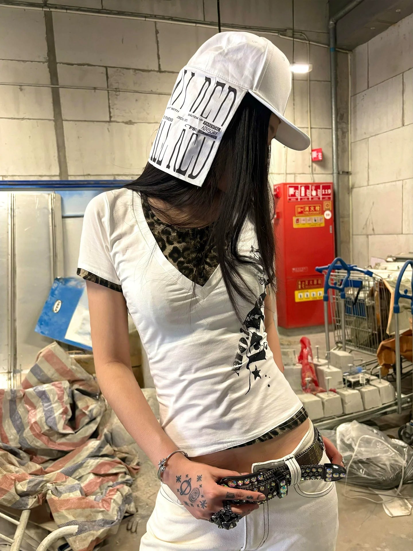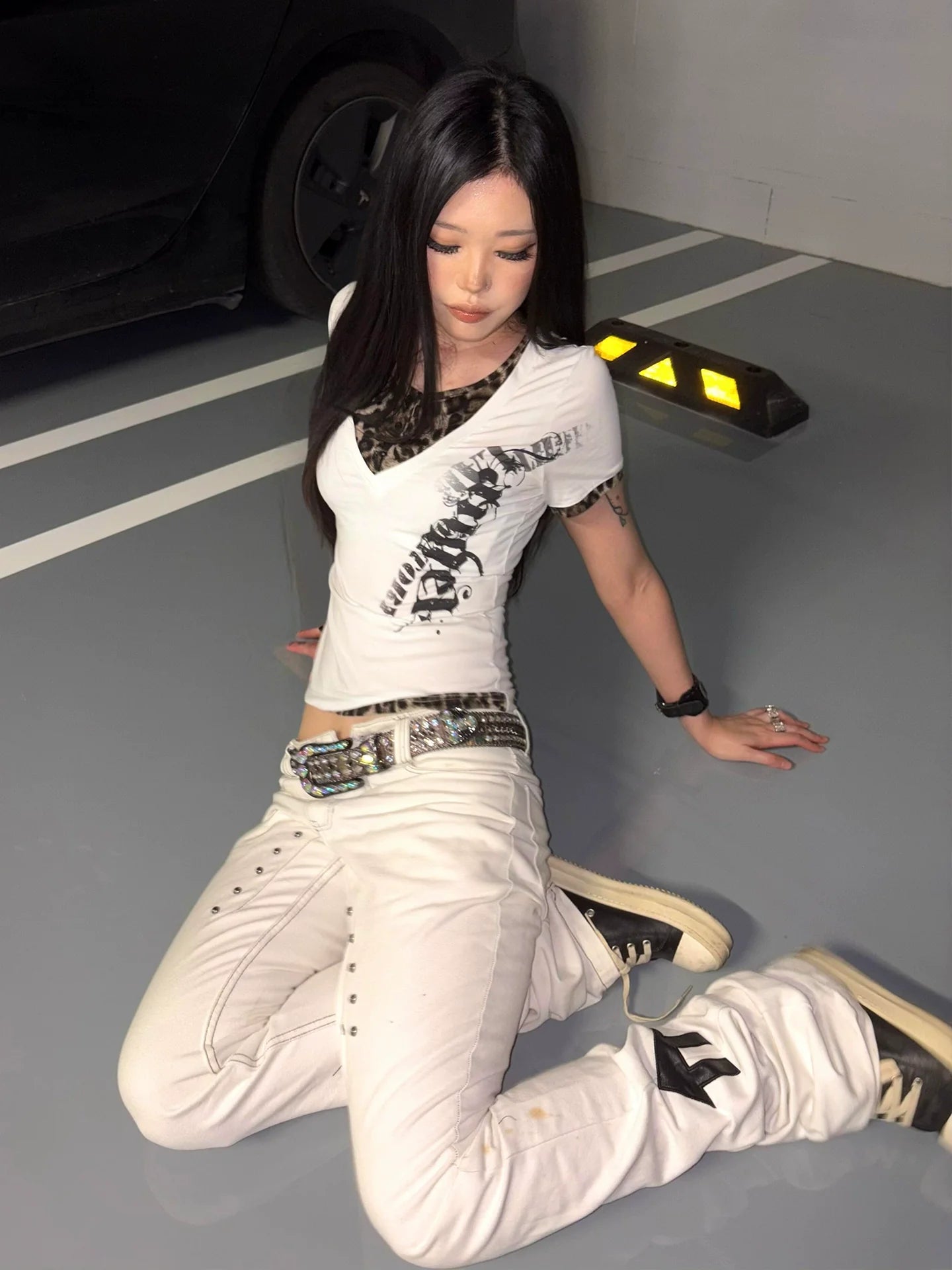 - Top: V-neck tee with straight shoulders, leopard & star patch design, Y2K light subculture style.
