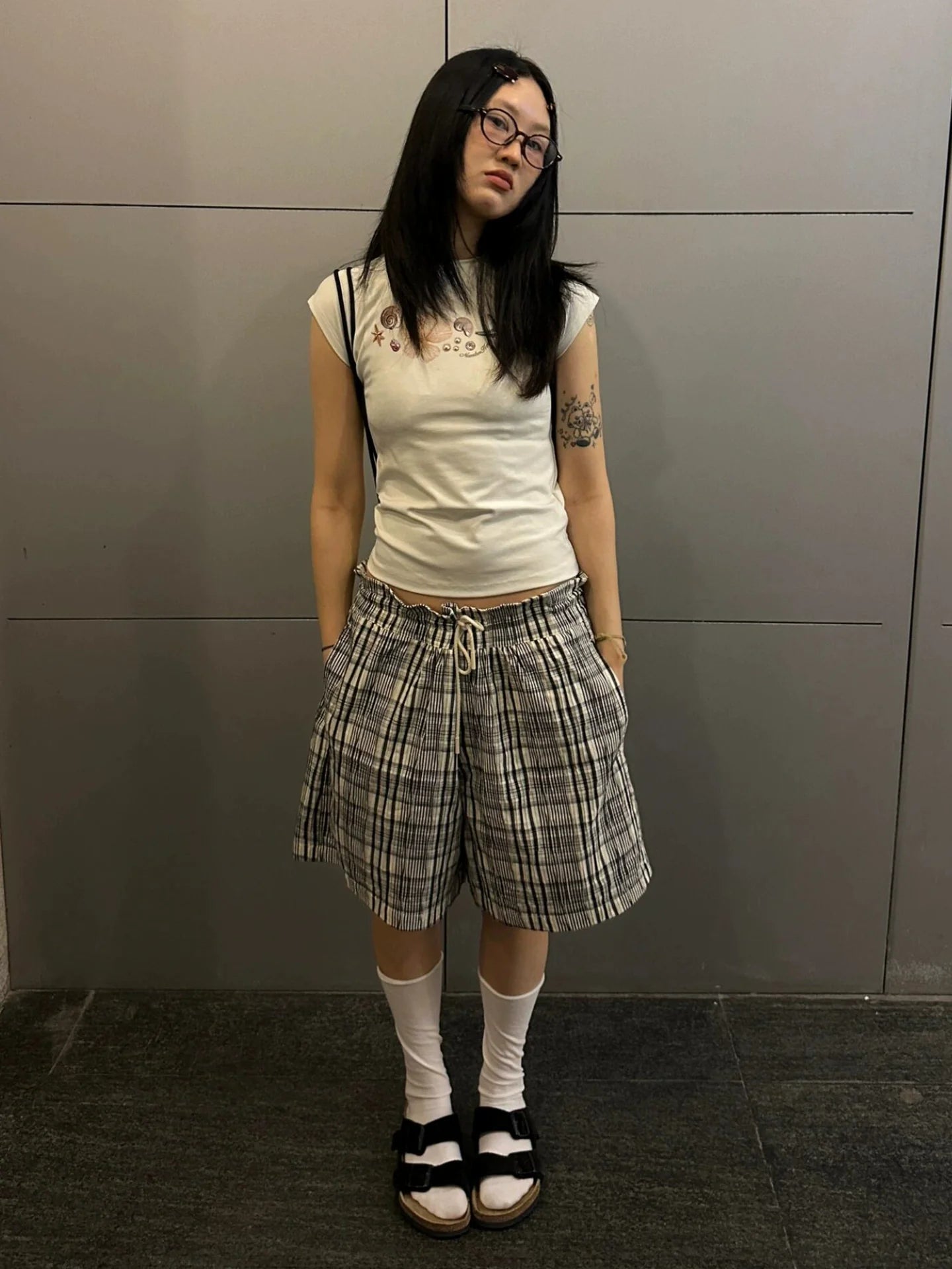 - Bottom: Textured plaid mid-length shorts with relaxed straight cut and lightweight breathable material.