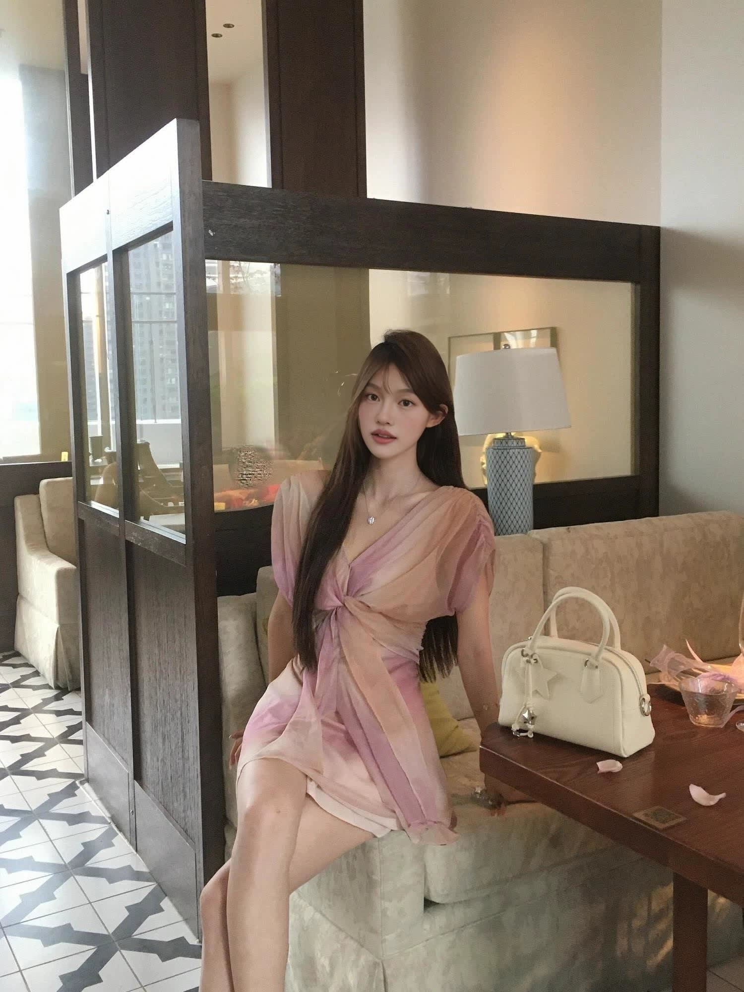 - Dress: Vibrant pink mini dress with V-neckline, ombre tulle layers, and lightweight fabric for a playful, elegant look.