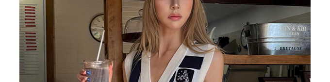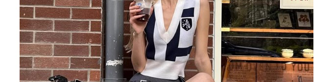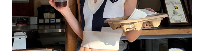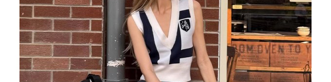 - Top: Sleeveless knit vest with academic-inspired design, short length and soft fabric.