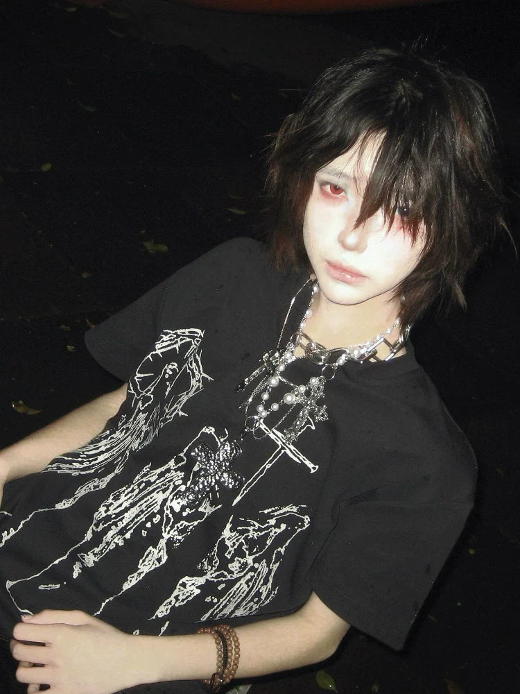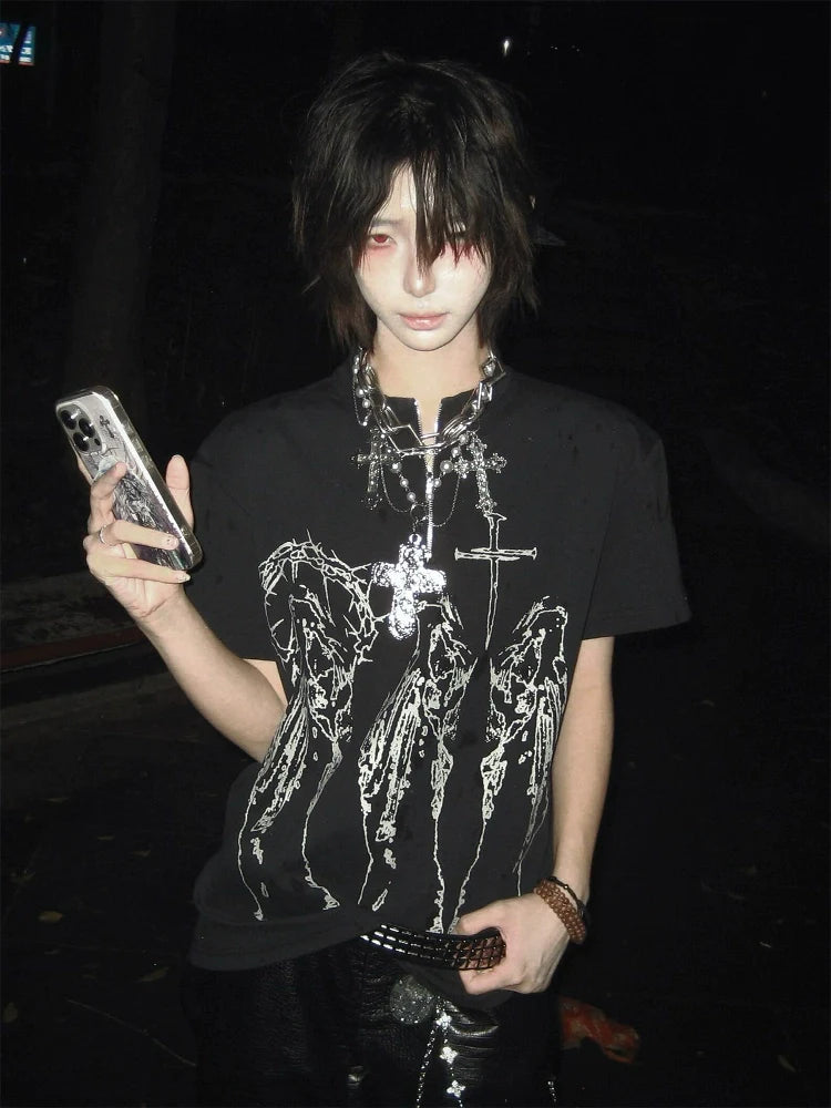 - Top: Summer black fitted short sleeve tee with zipper details, soft cotton, slim fit, visual kei and Y2K punk aesthetic.