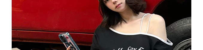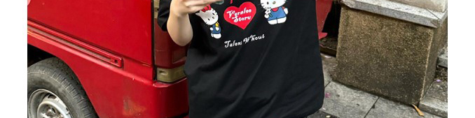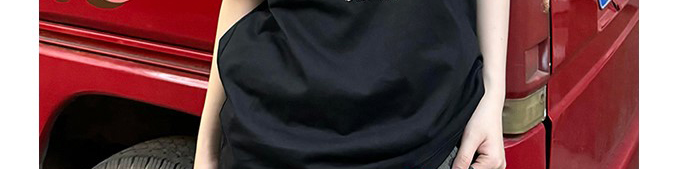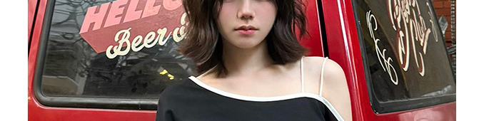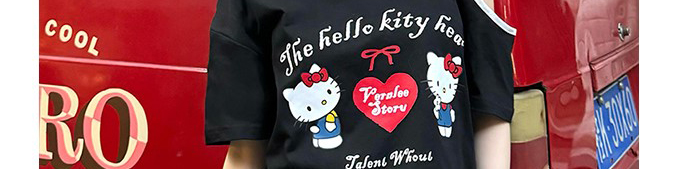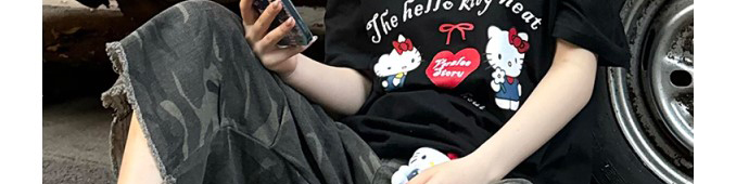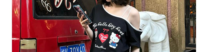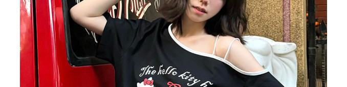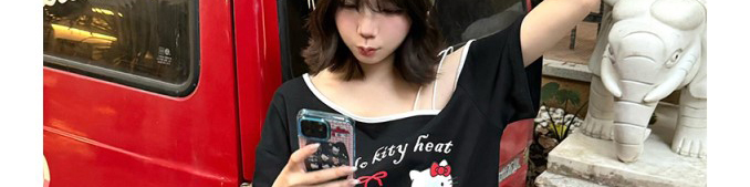 - Top: Slim-fit cotton tee with off-shoulder cut and cute cat print, breathable and lightweight.