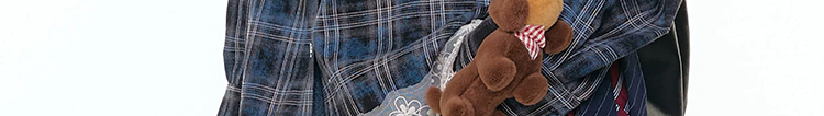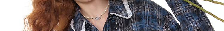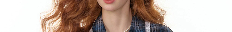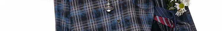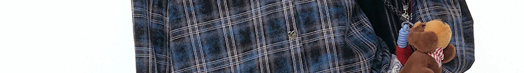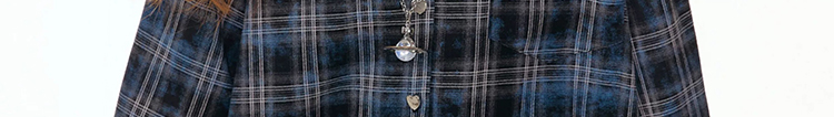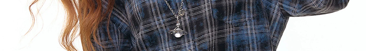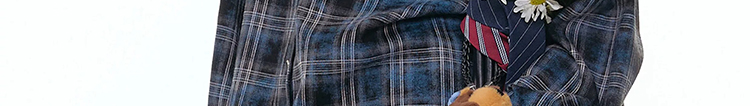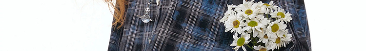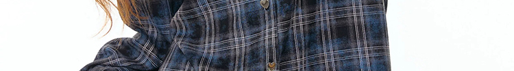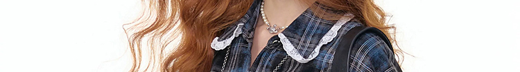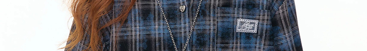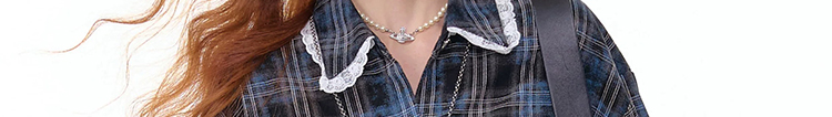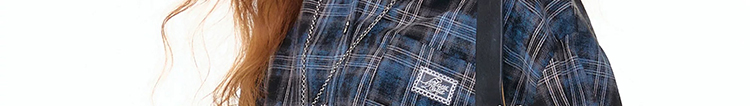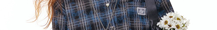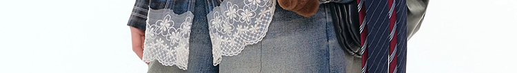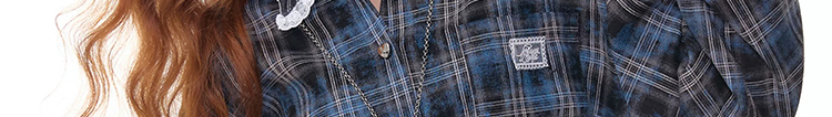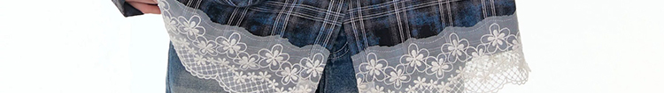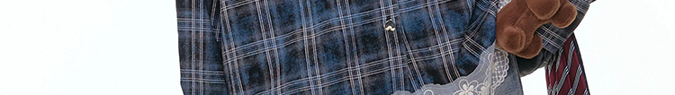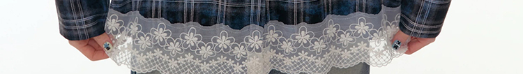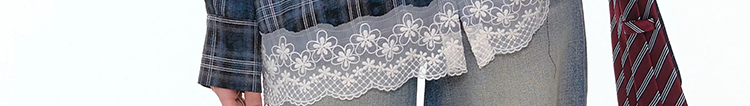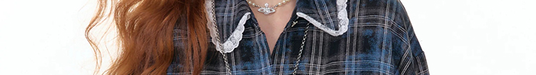 - Top: Loose-fit long-sleeve shirt with check pattern and lace patchwork, soft autumn fabric.
