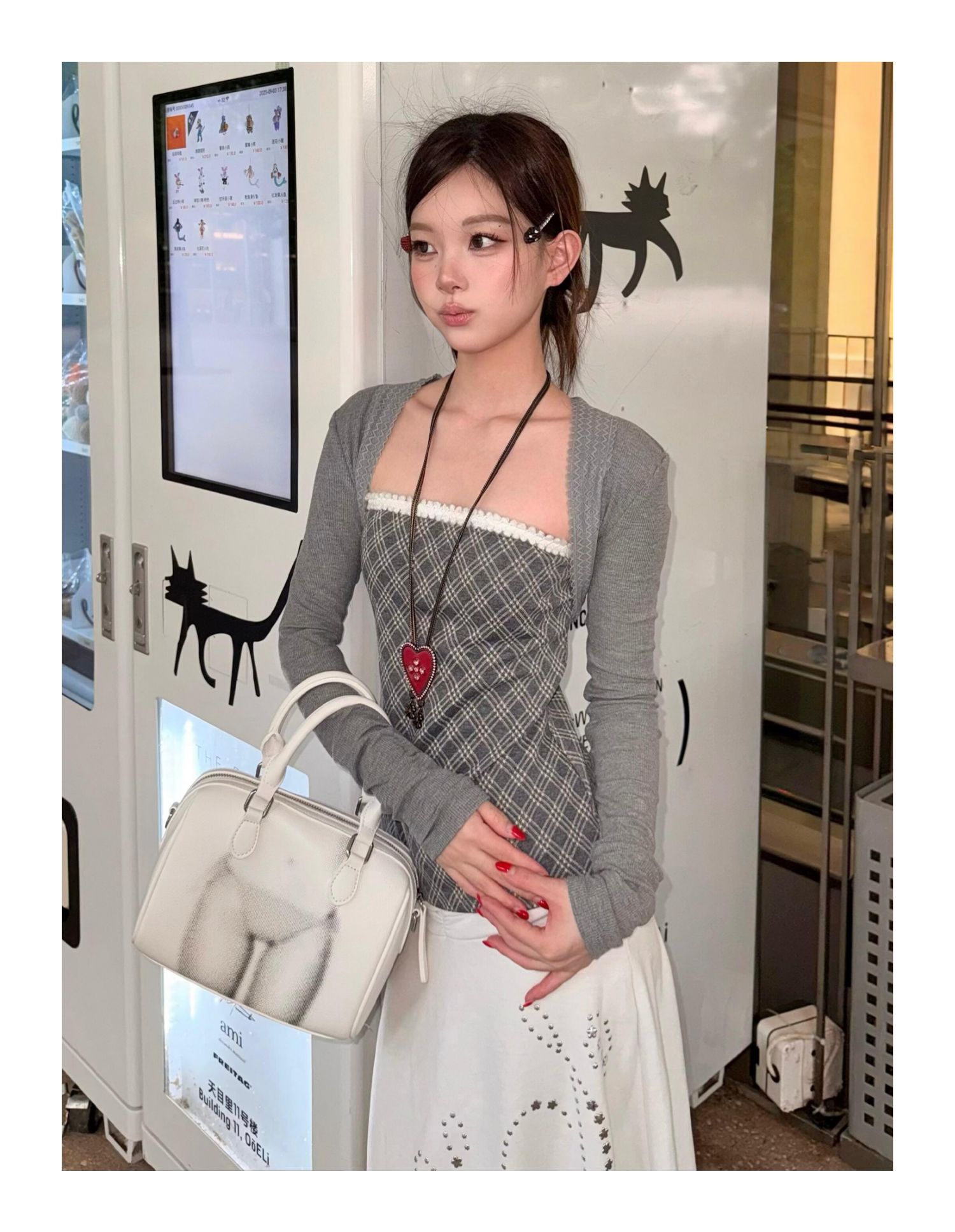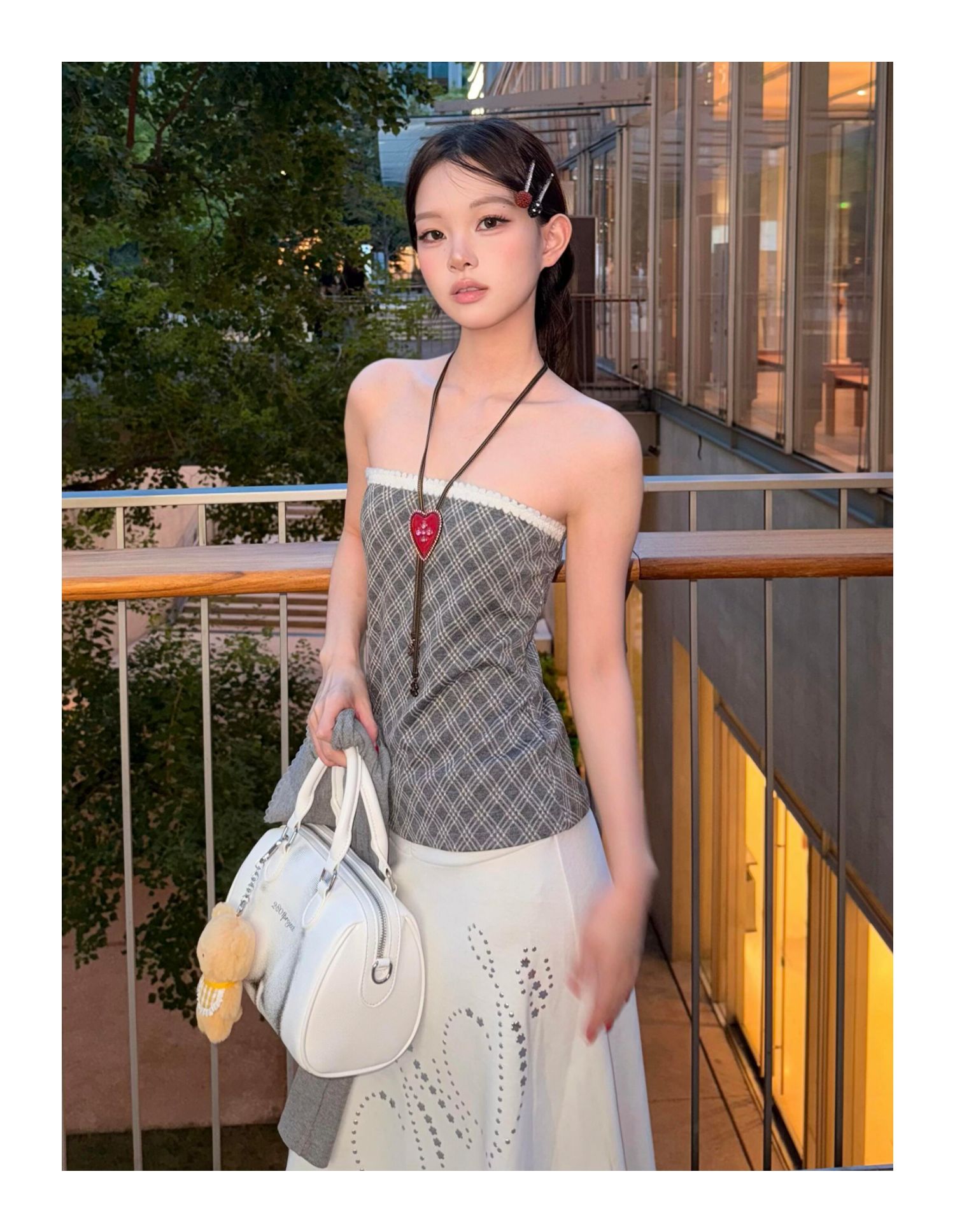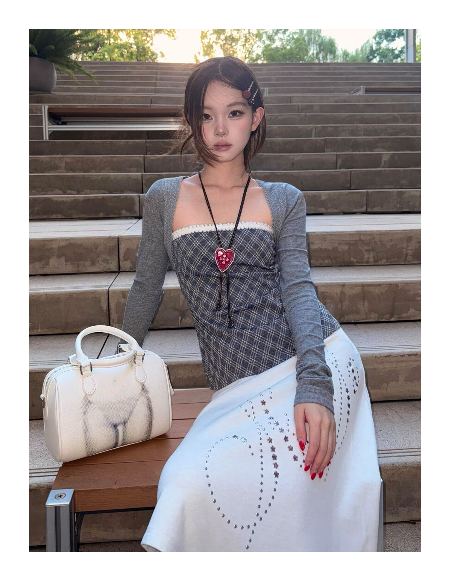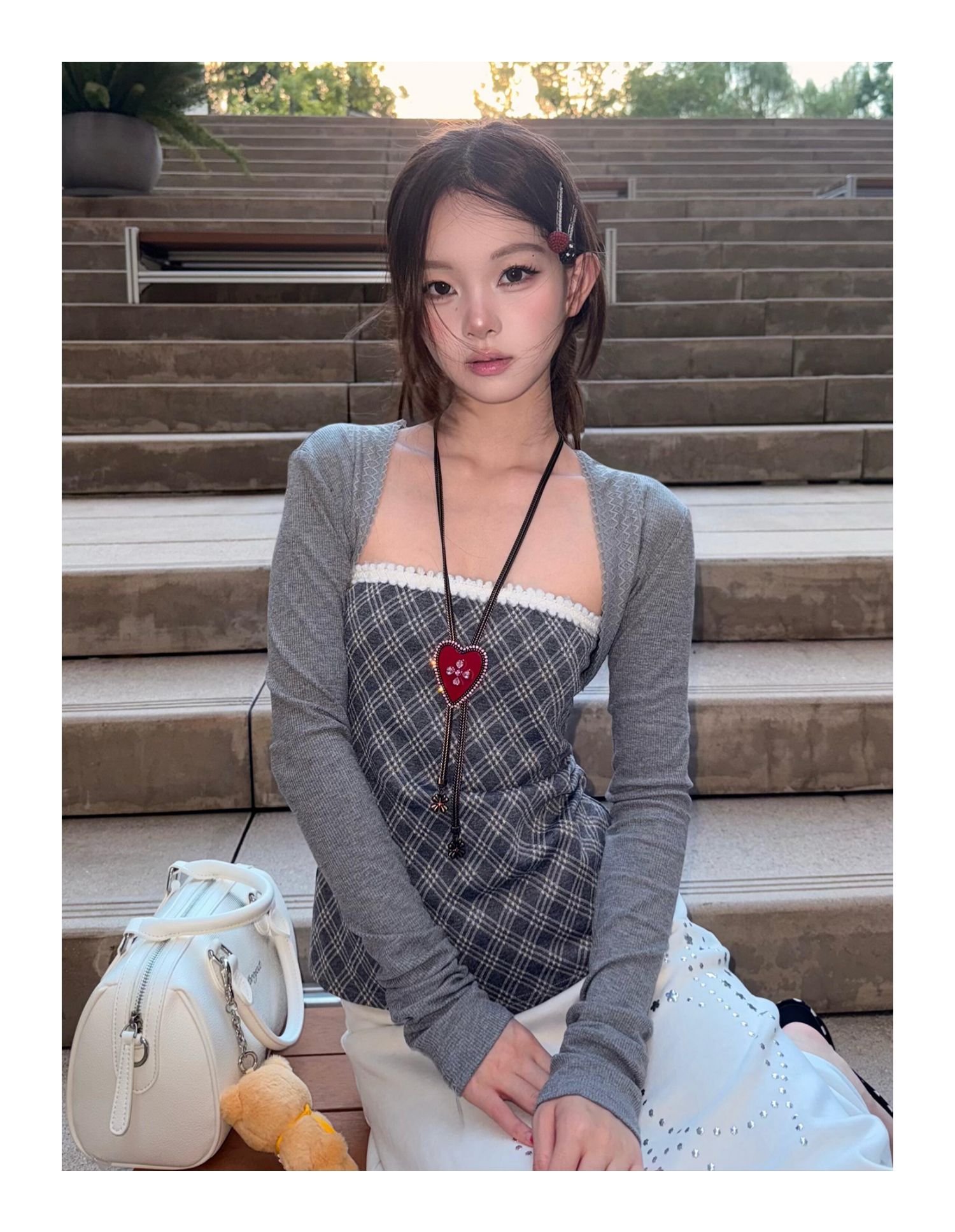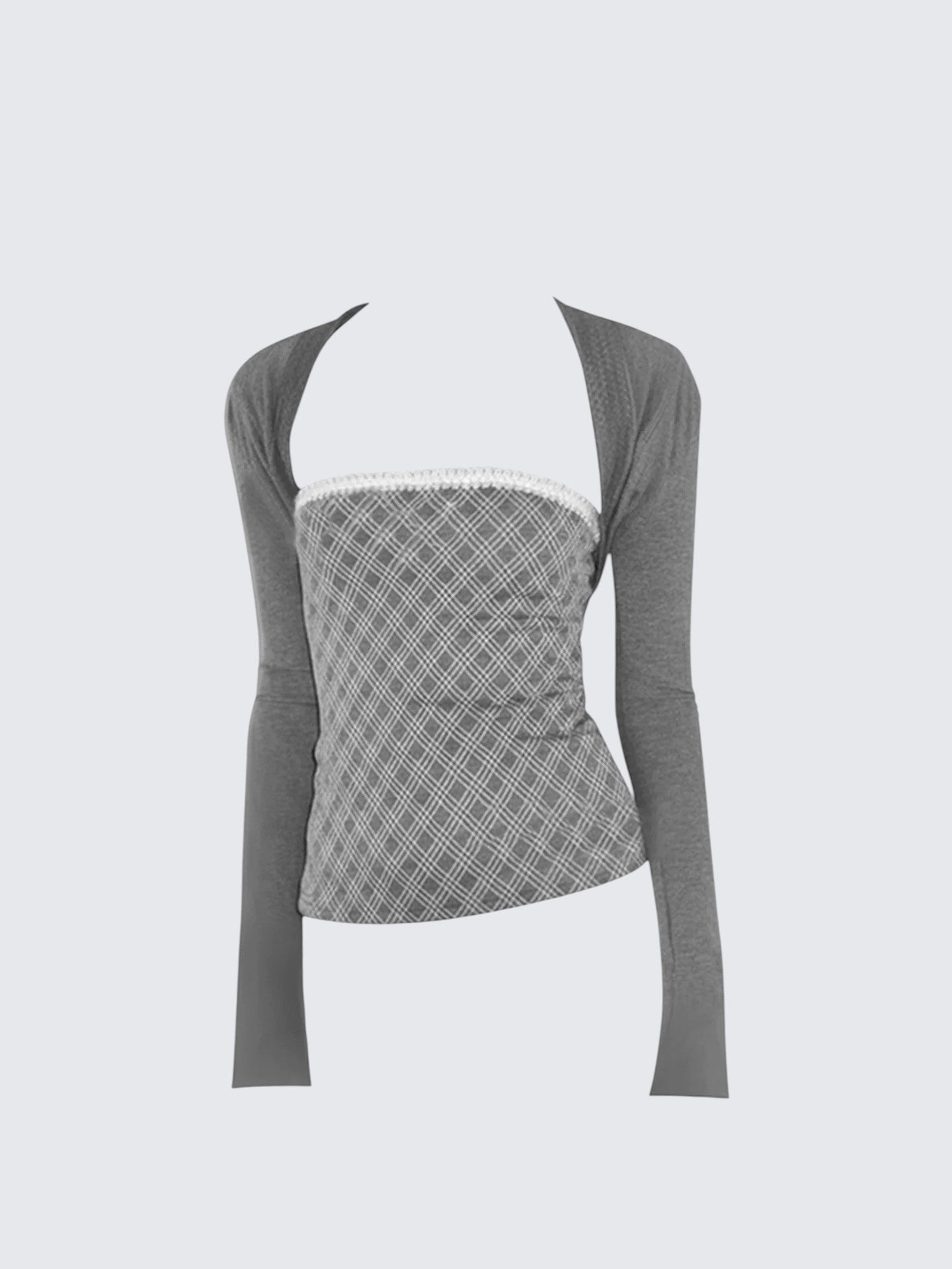 - Top: Two-piece set with slim-fit long sleeve knit and checkered bustier, soft autumn fabric.