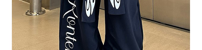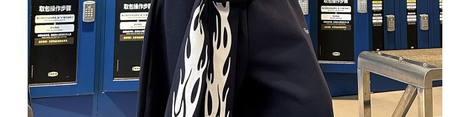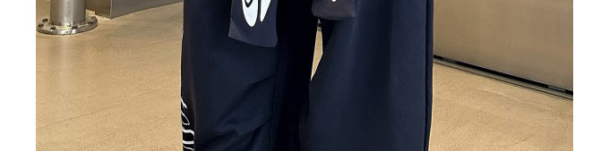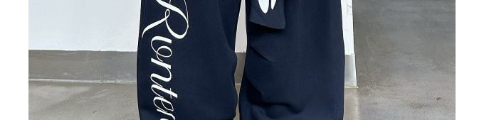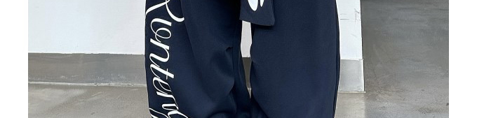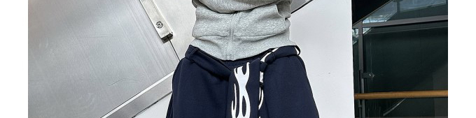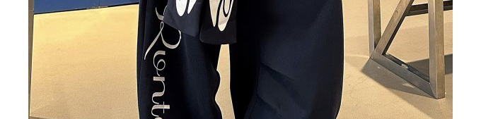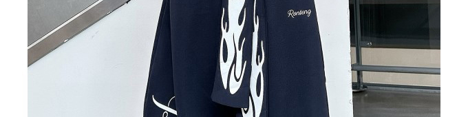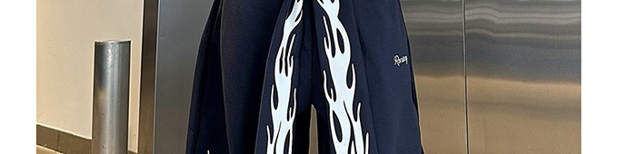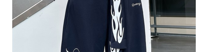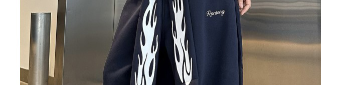 - Pants: Loose-fit straight-leg sweatpants with flame ribbon and letter print, soft autumn fabric, streetwear style.