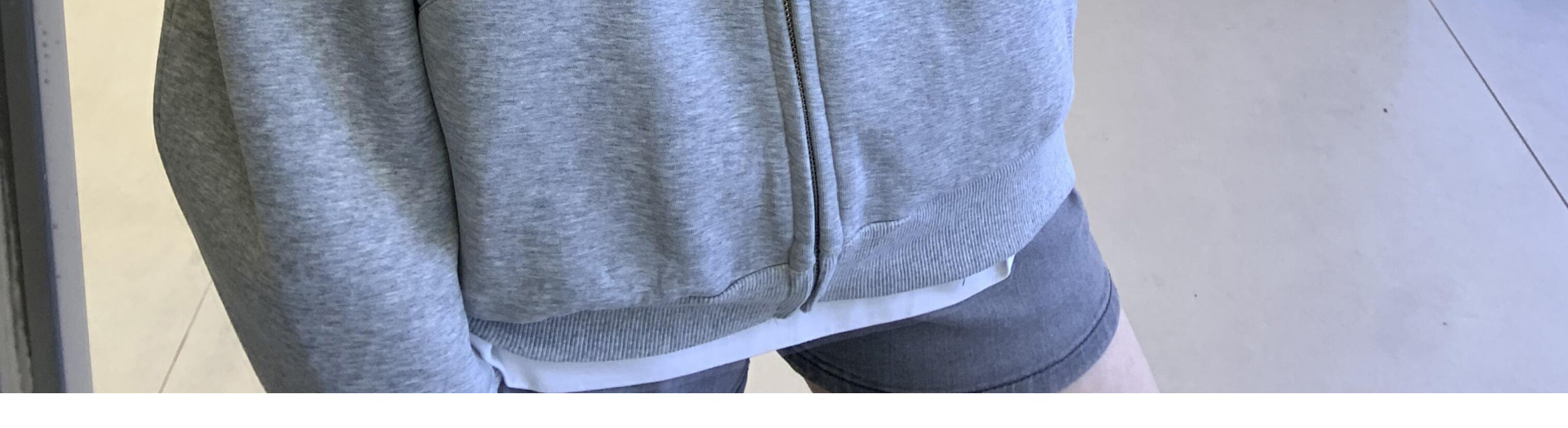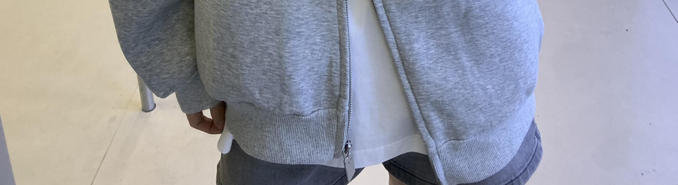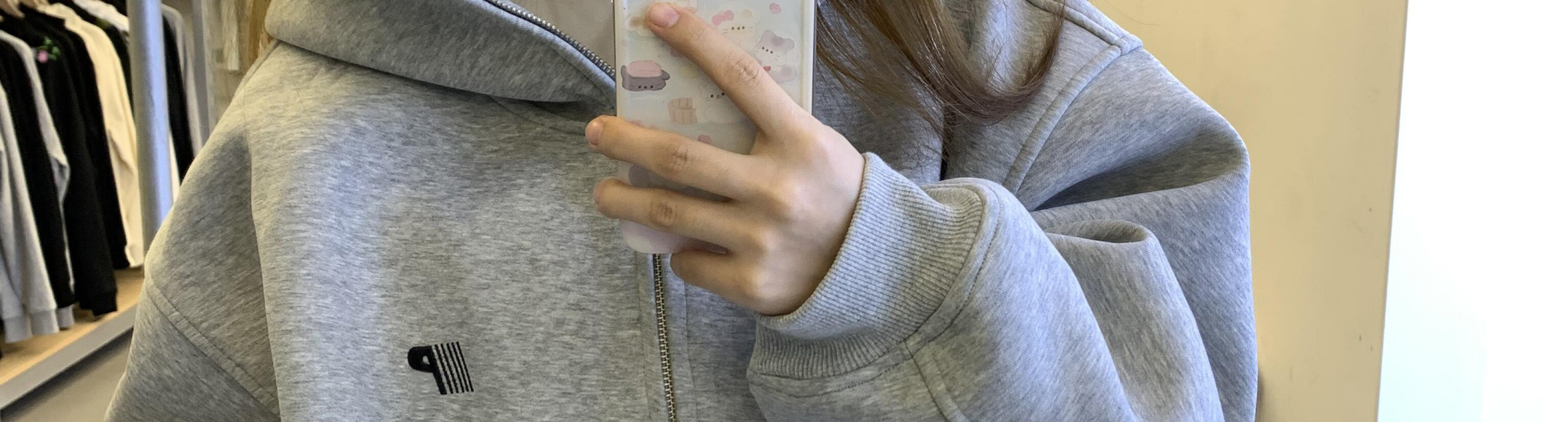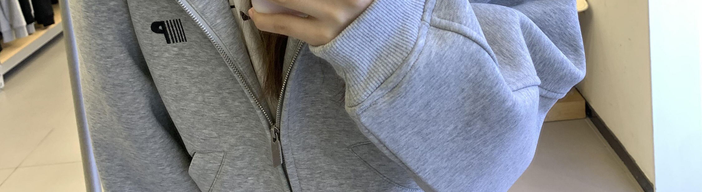 - Top: Heavyweight gray zip-up hoodie, loose-fit early autumn fabric, cozy casual style.