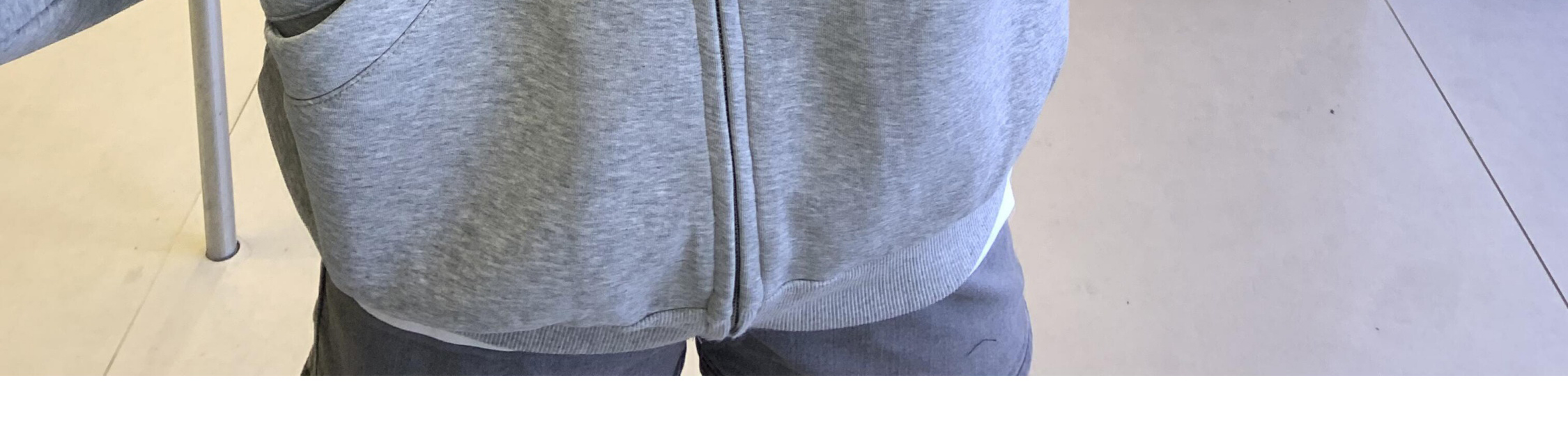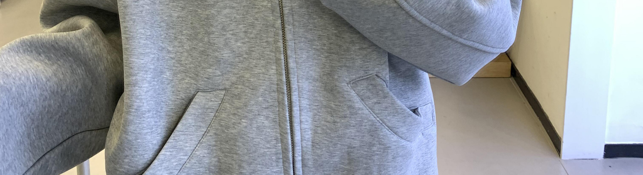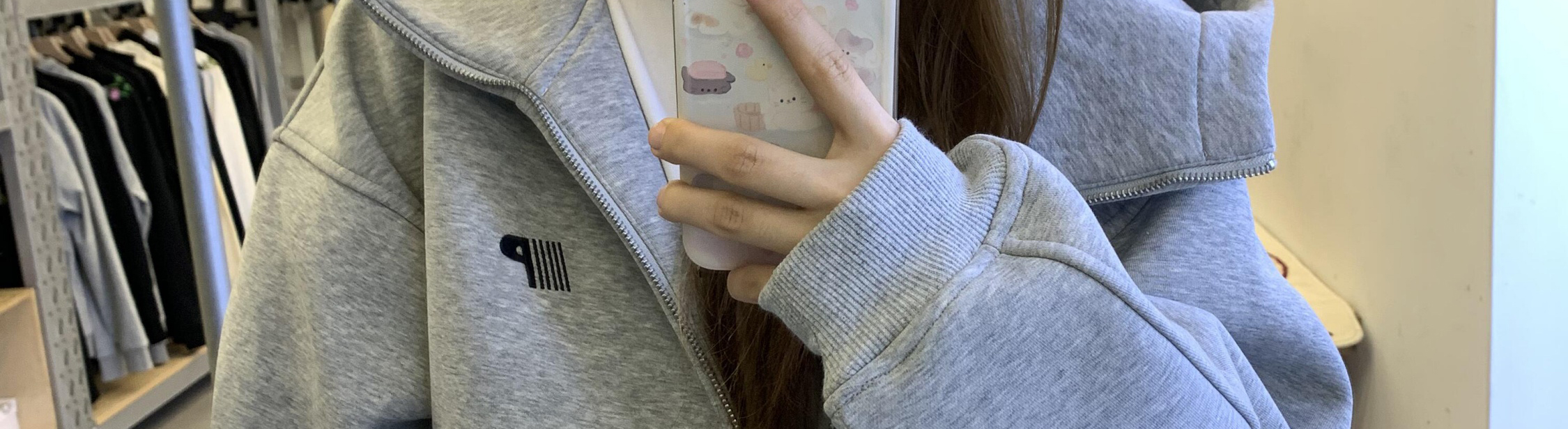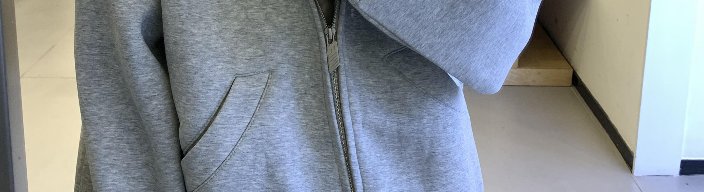 - Top: Heavyweight gray zip-up hoodie, loose-fit early autumn fabric, cozy casual style.