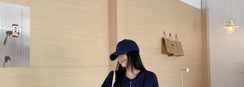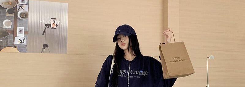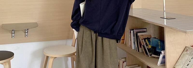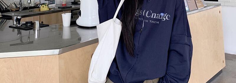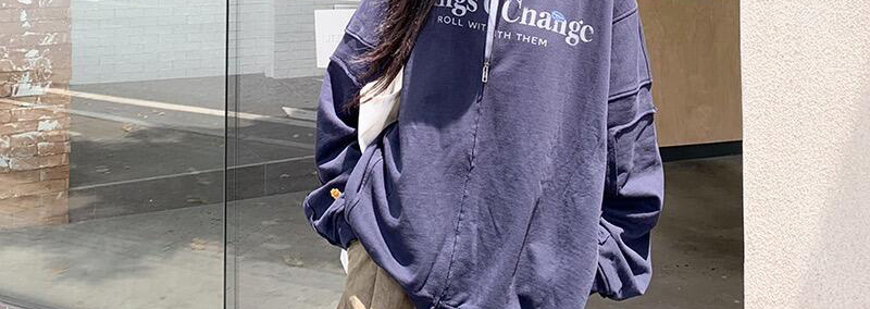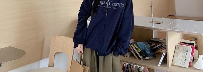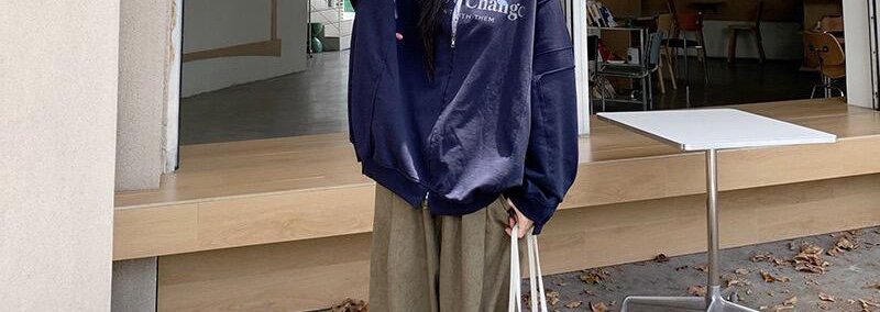 - Top: Loose-fit navy hoodie with letter print, zip closure, soft autumn fabric, casual style.