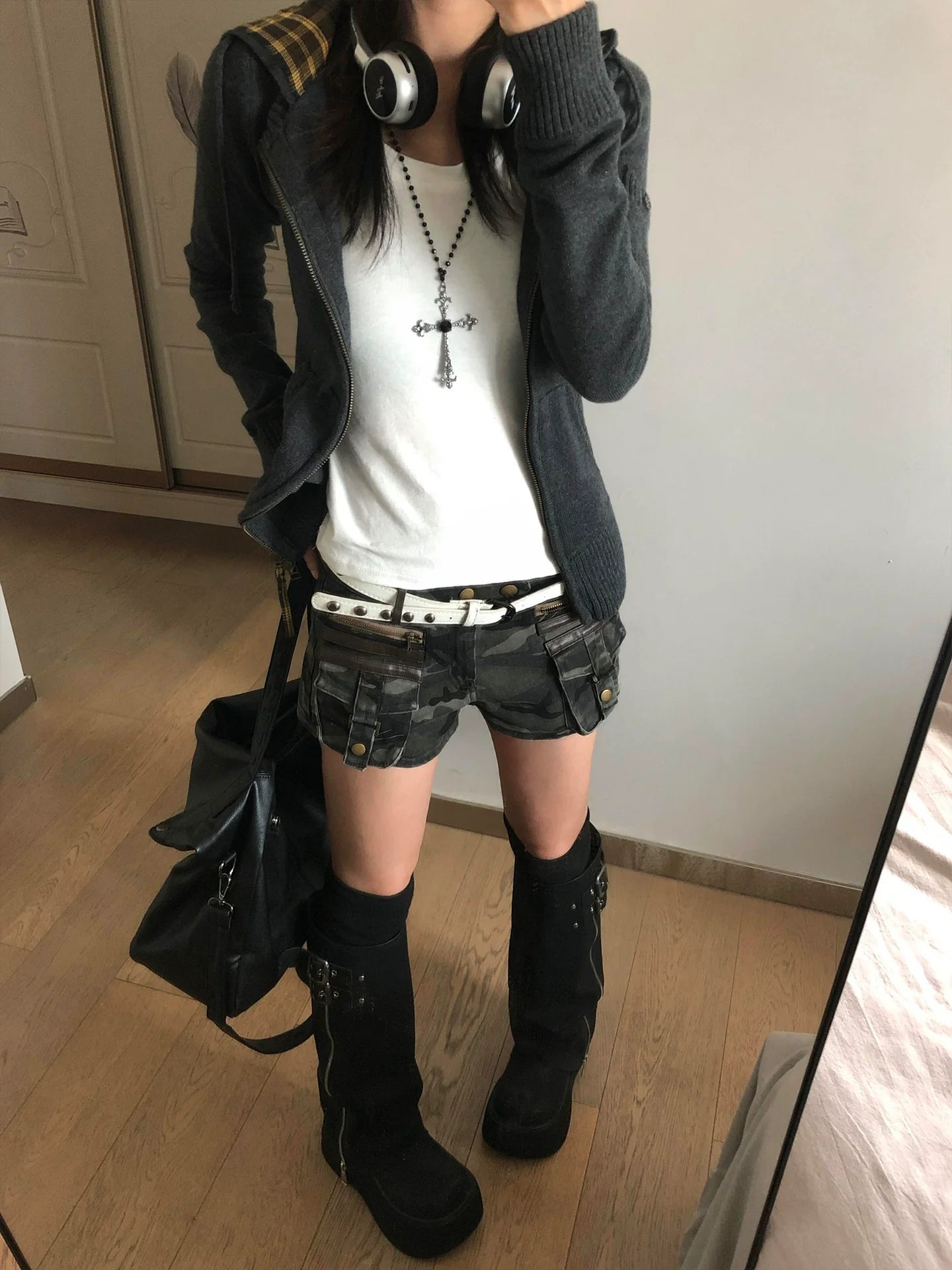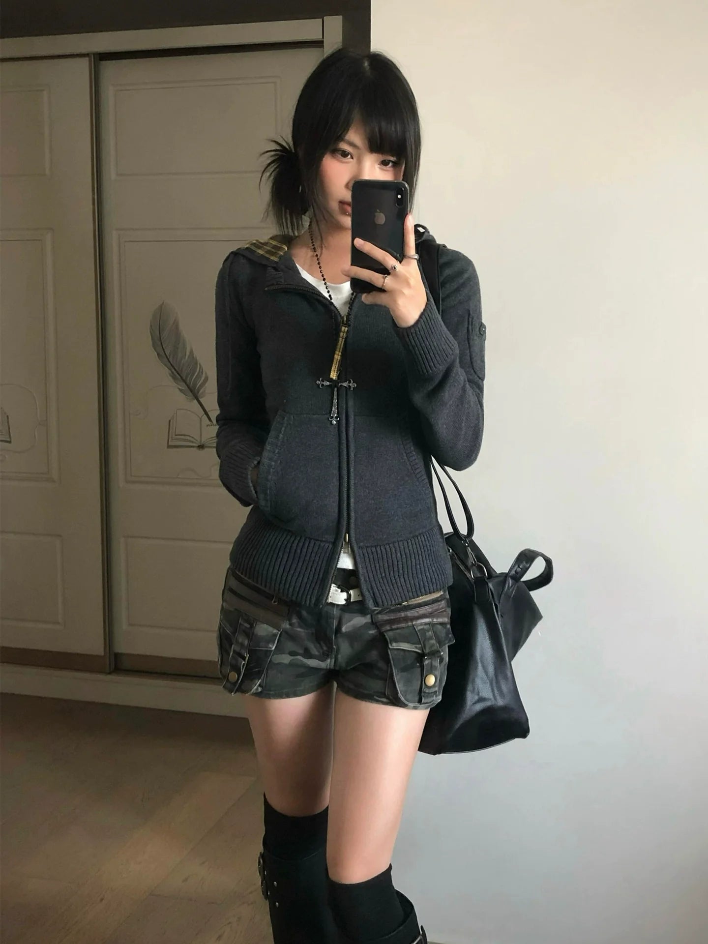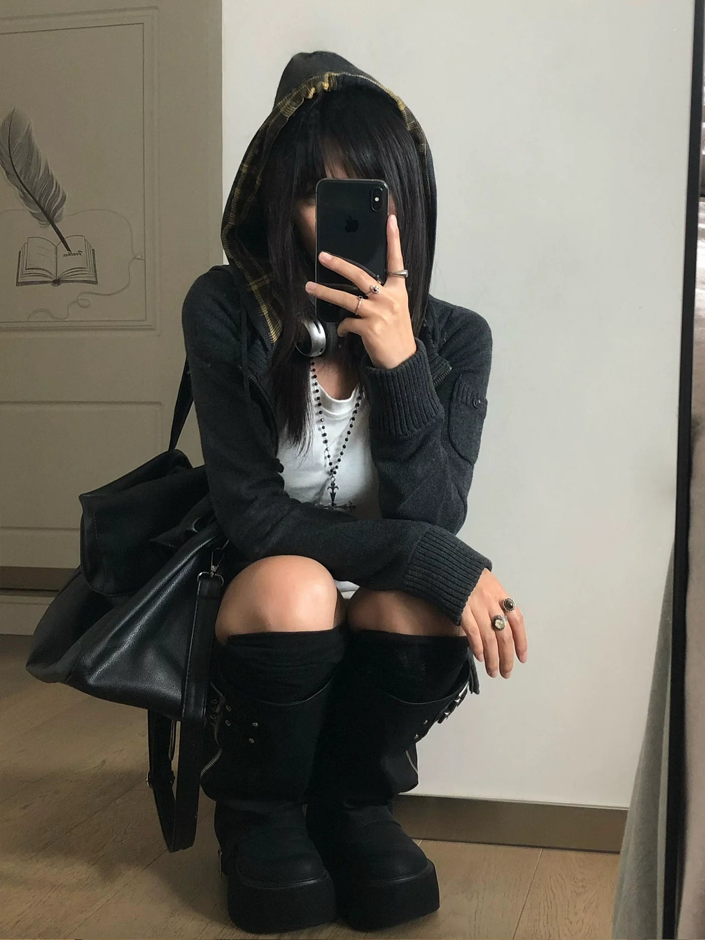 - Top: Plaid knit cardigan with hood, slim fit, soft textured fabric, perfect for retro Y2K layering and cozy early autumn outfits.