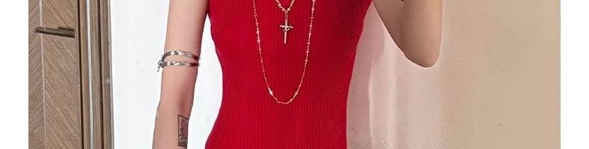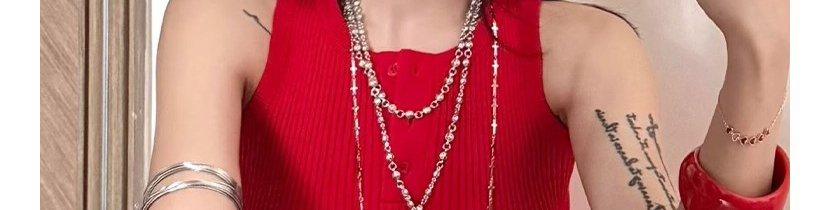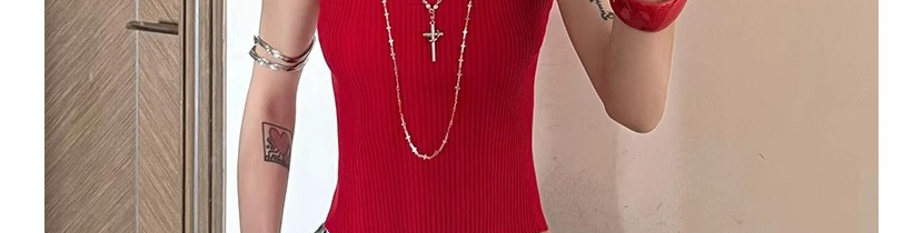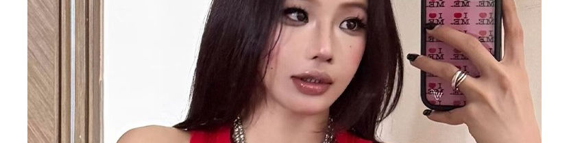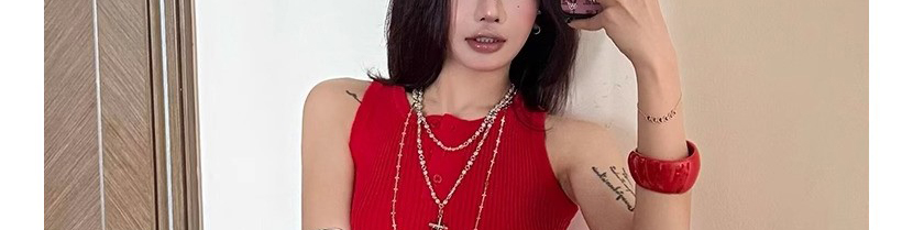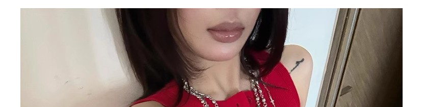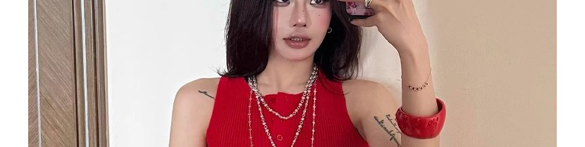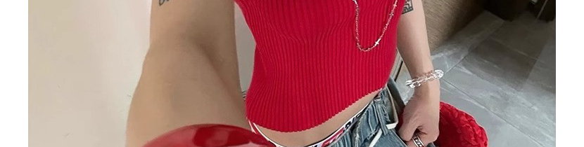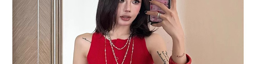 - Top: Slim-fit sleeveless ribbed vest with button details, soft summer fabric, chic red color.