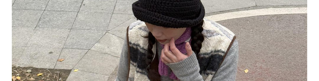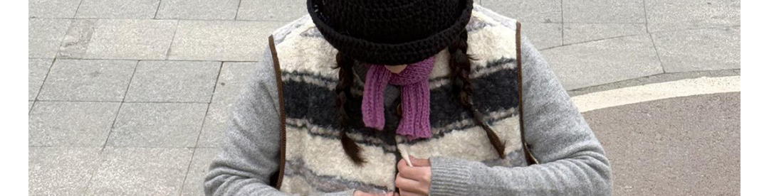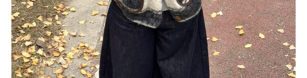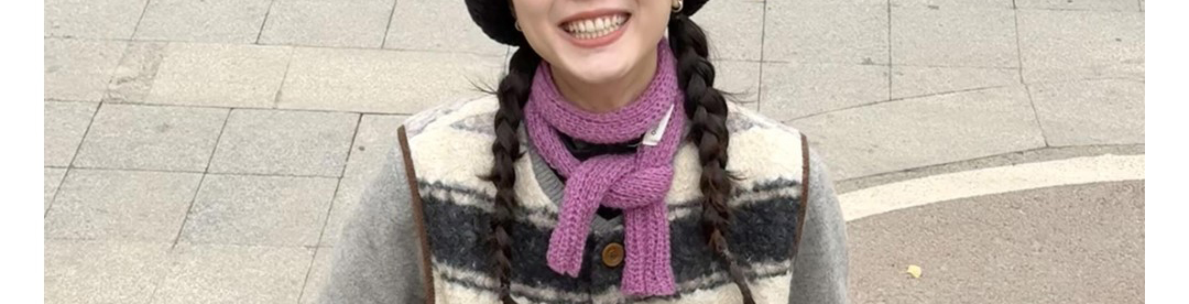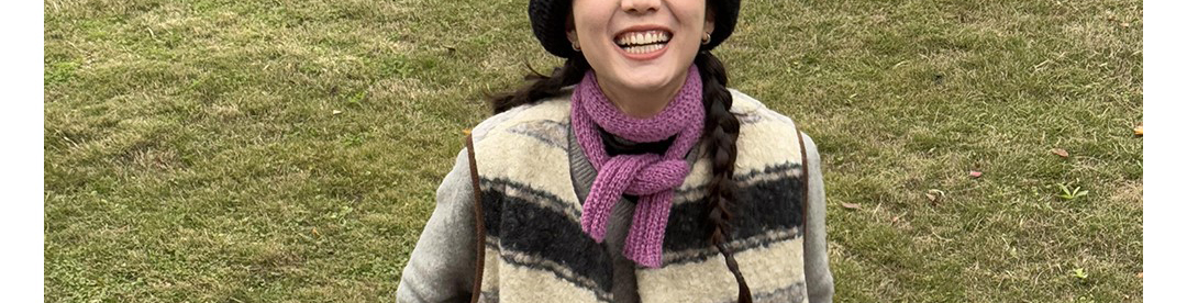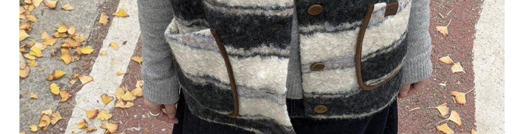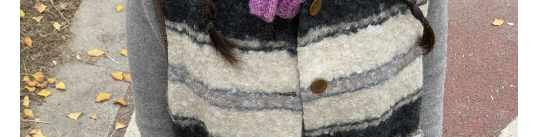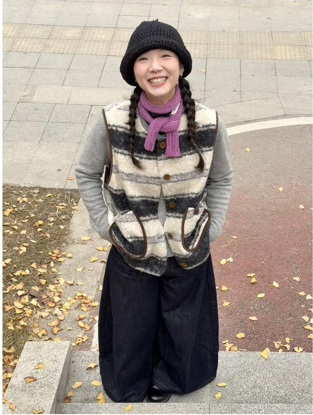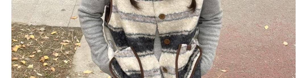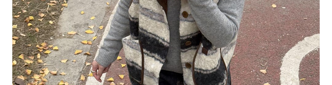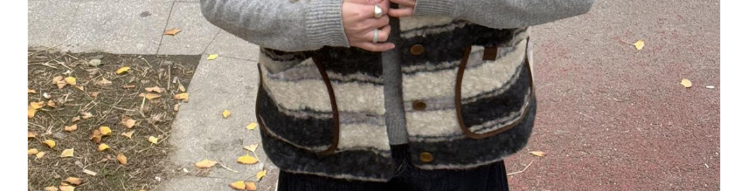 - Top: Sleeveless shearling vest with color-block striped design, warm and soft autumn-winter fabric.
