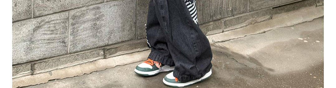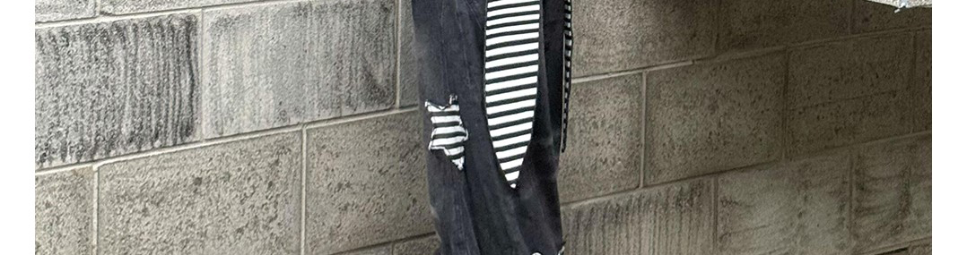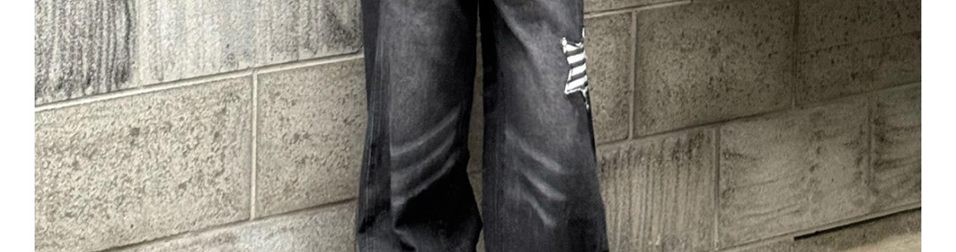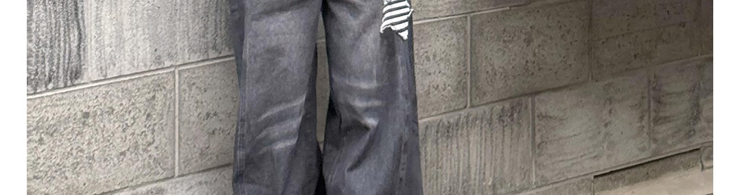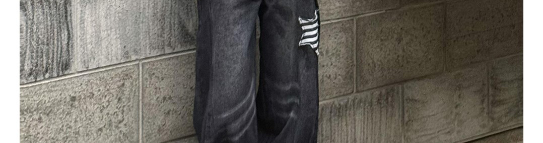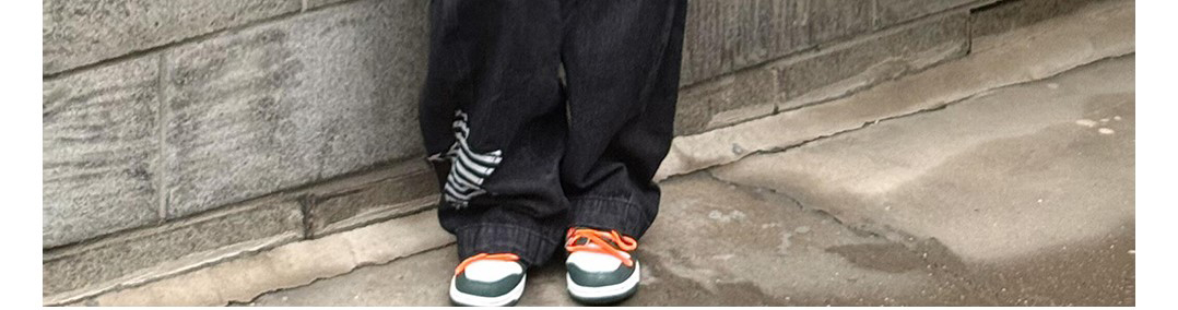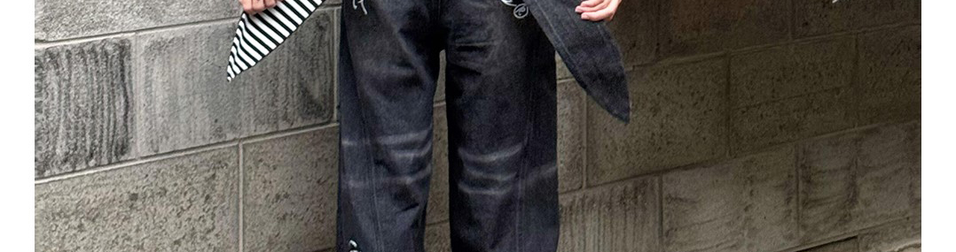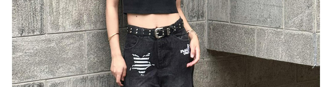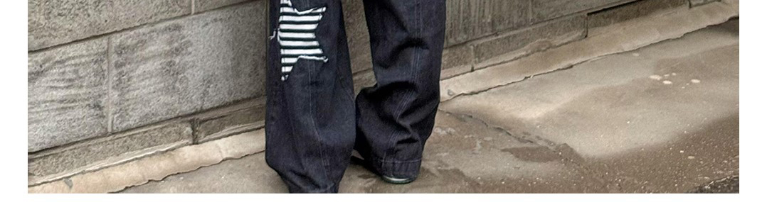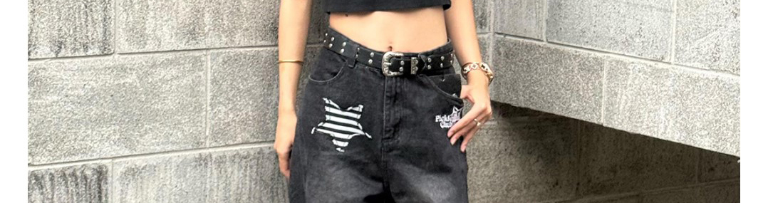 - Pants: Loose-fit black denim with star embroidery, soft summer fabric, wide-leg streetwear style.