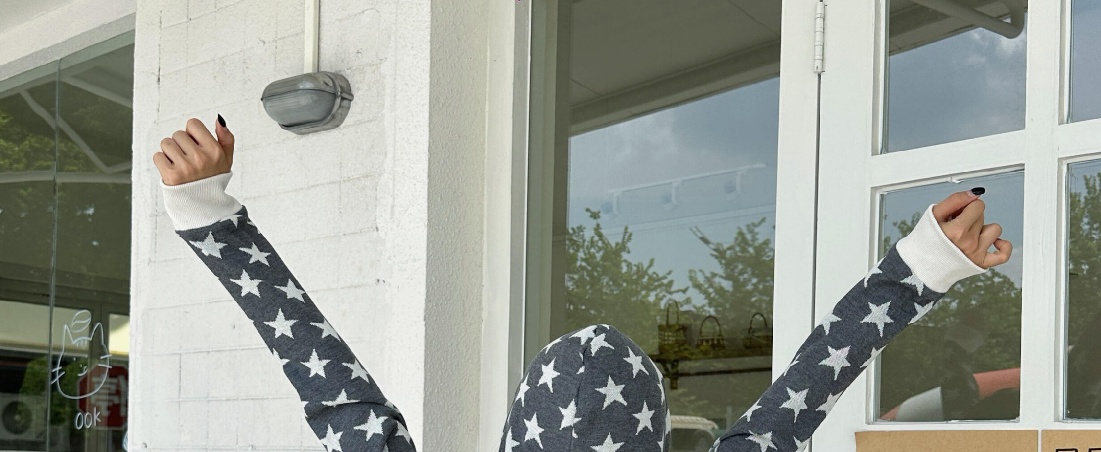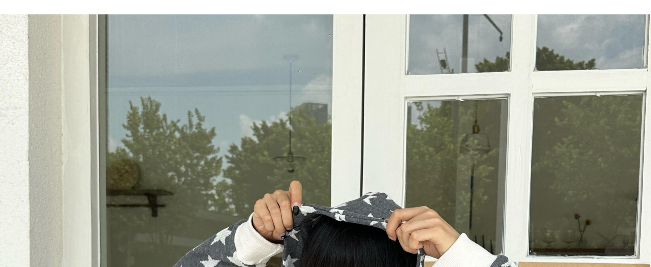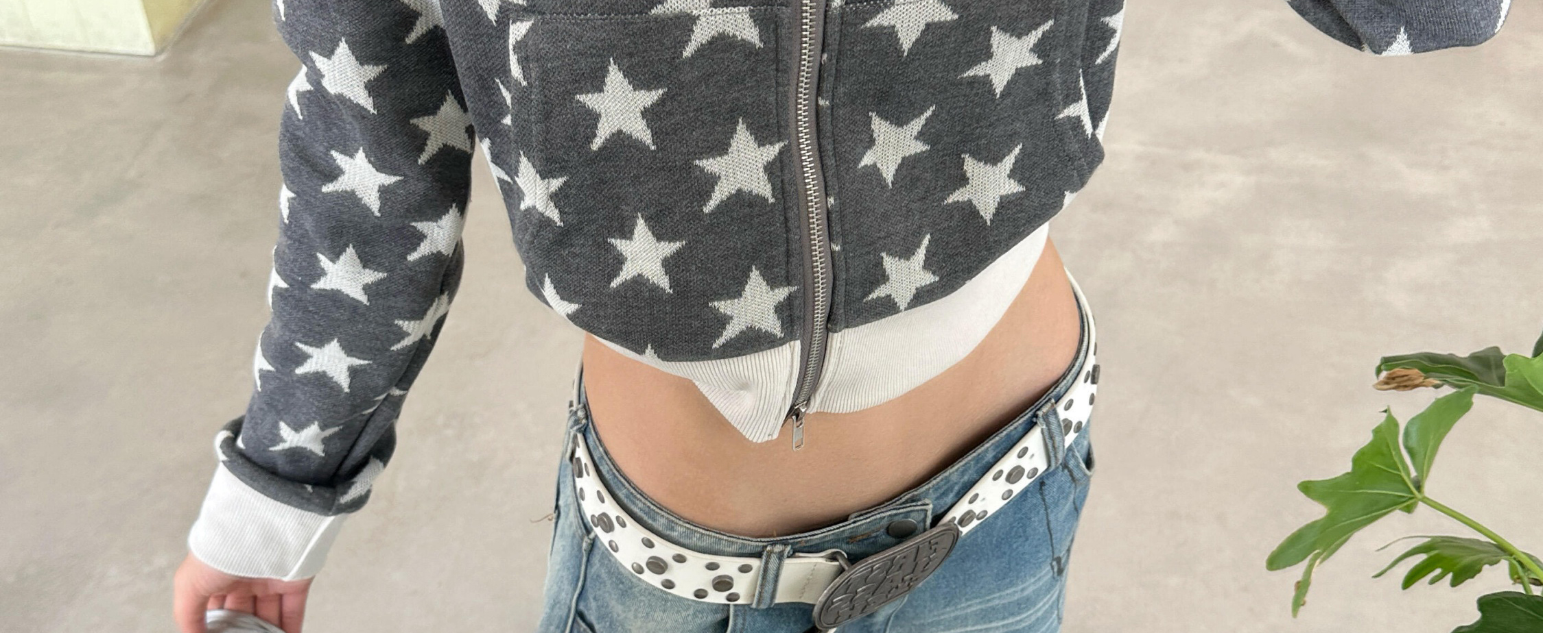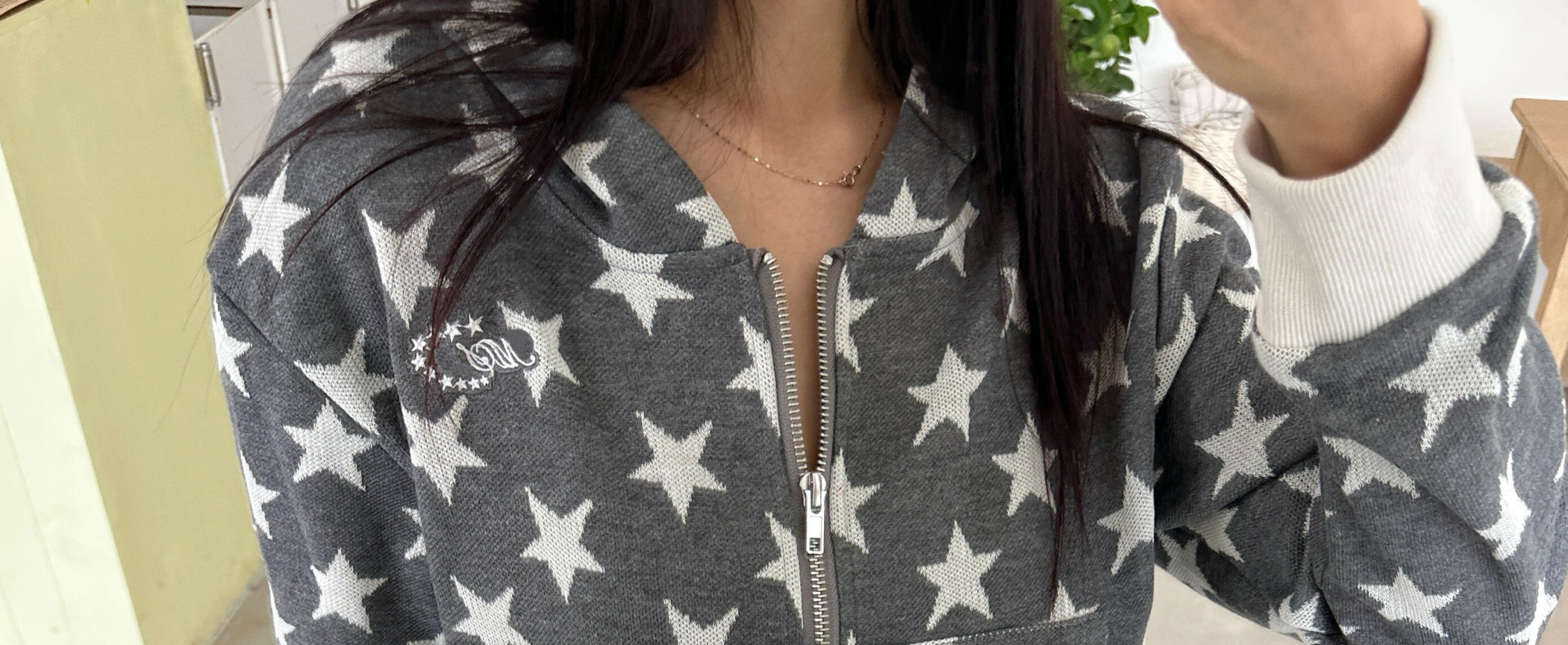 - Top: Short hooded sweatshirt with star print, relaxed fit, soft early autumn fabric.