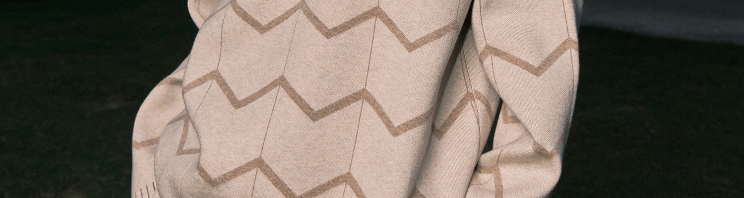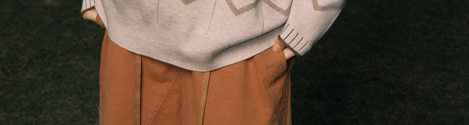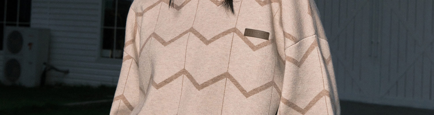 - Top: Loose-fit crewneck long sleeve knit with retro stripe pattern, soft autumn fabric, cozy texture.