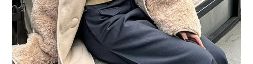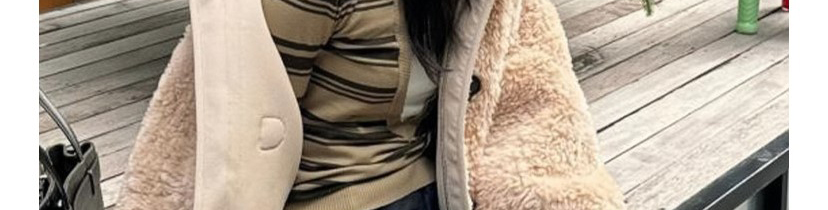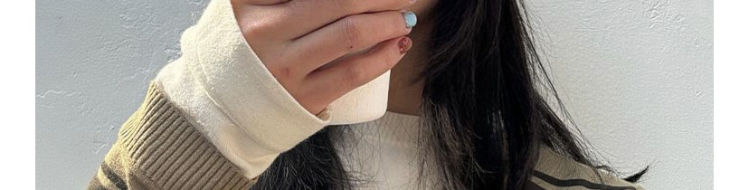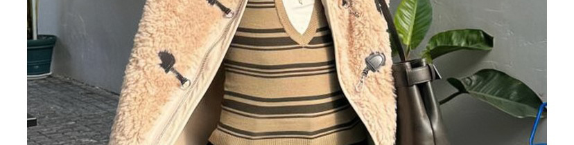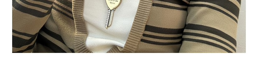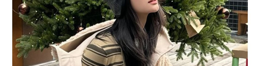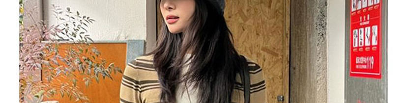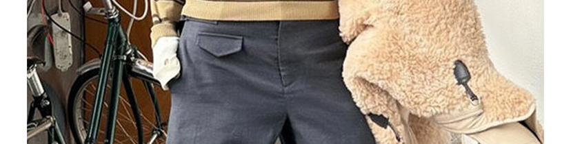 - Top: Long-sleeve knit top with striped contrast V-neck layered look for a casual retro touch.