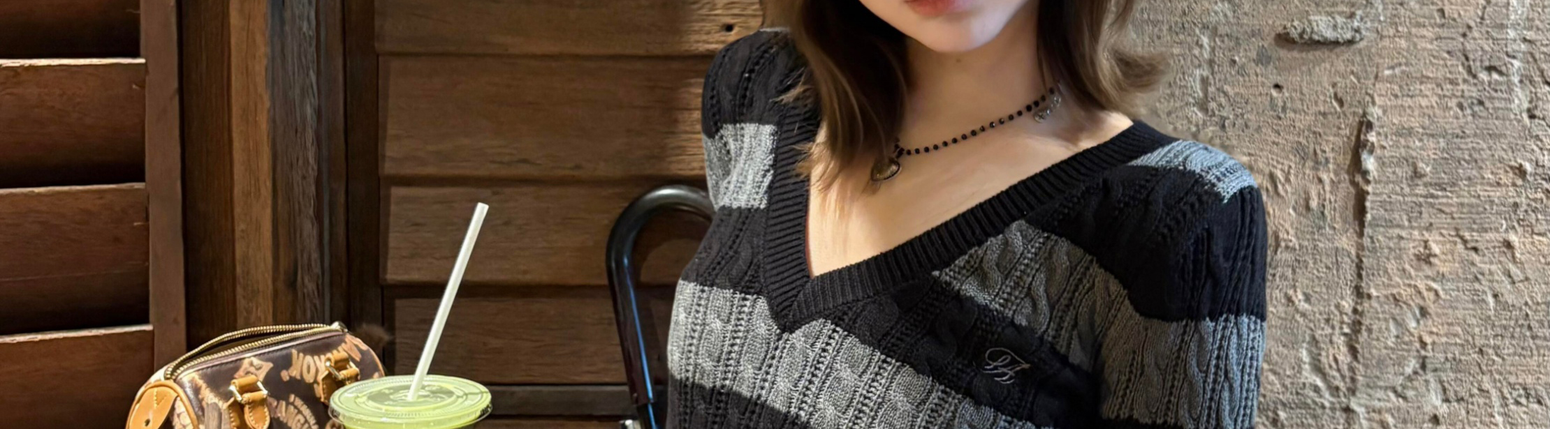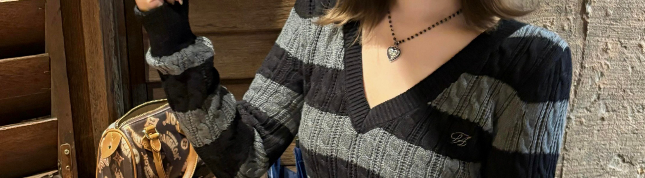 - Top: Slim-fit knit sweater with V-neck, striped pattern, cable knit texture, and contrast colors, soft autumn fabric.