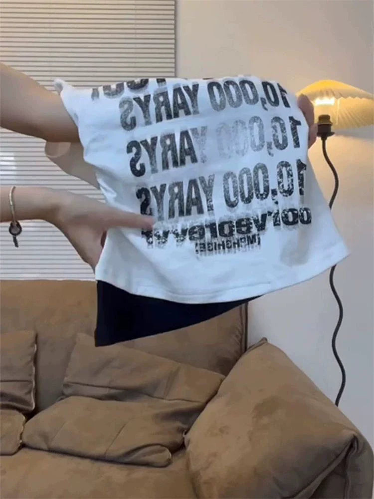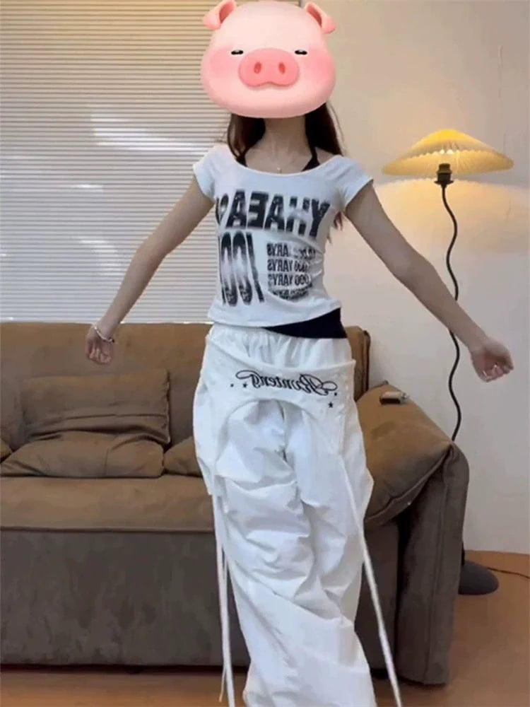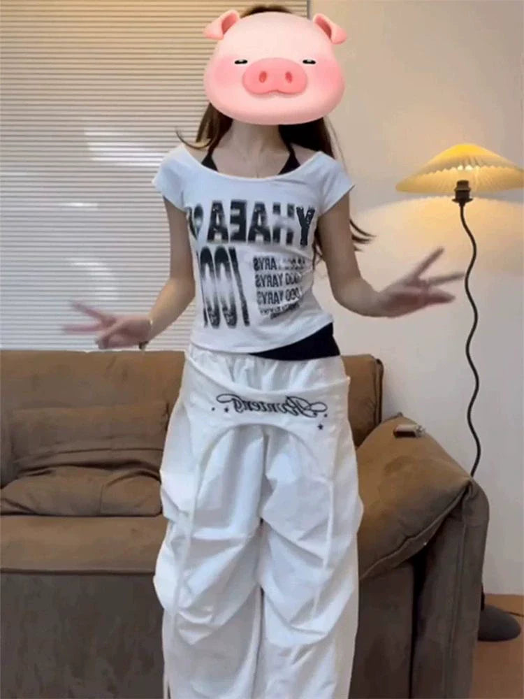 - Top: White short-sleeve T-shirt with American vintage details, fake two-piece design, and off-shoulder halter silhouette, capturing Y2K subculture () vibes for summer.