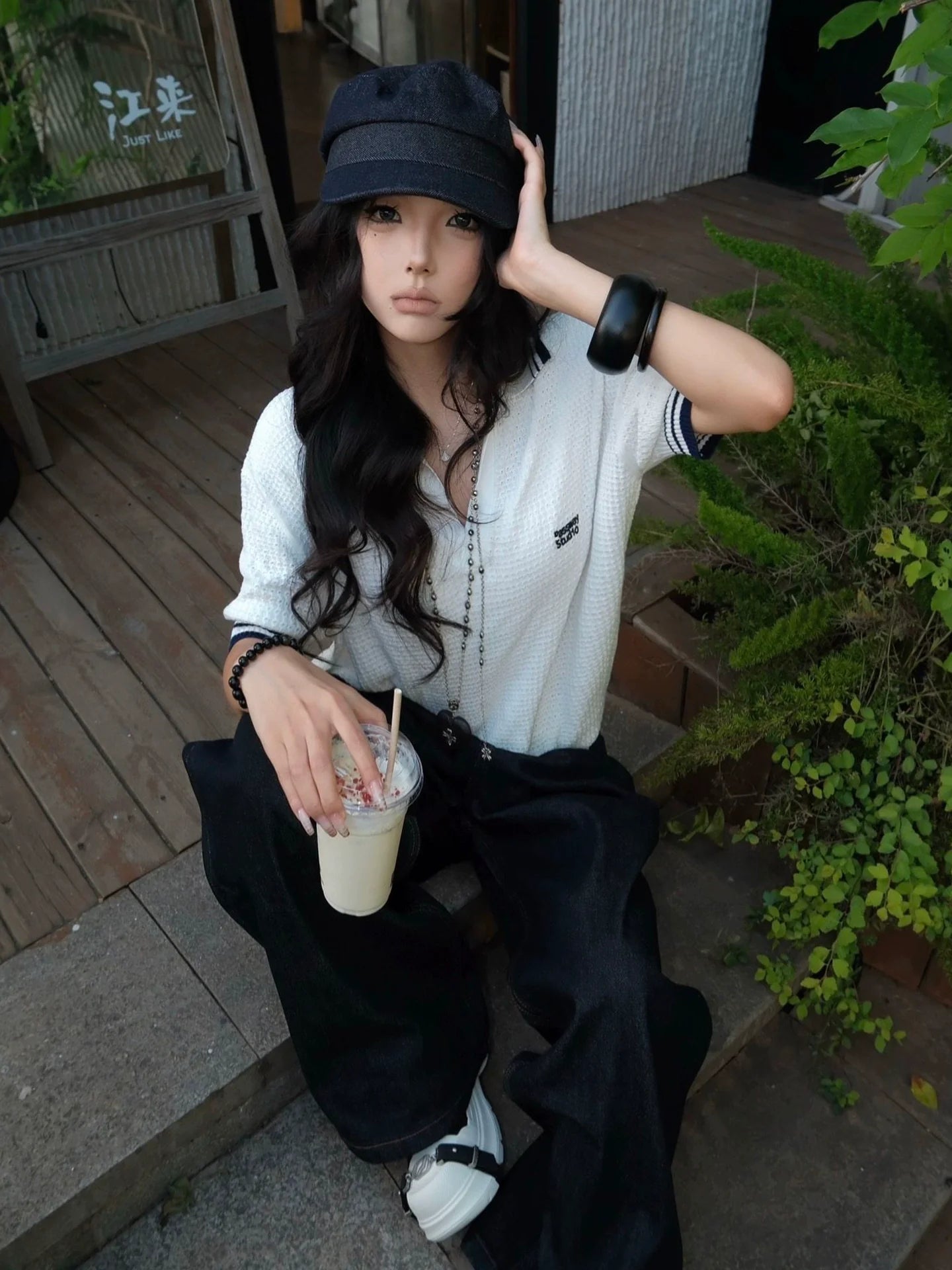- Top: Summer knit polo tee with cutout V-neck, soft cotton, relaxed fit, vintage Y2K aesthetic, casual layering essential.