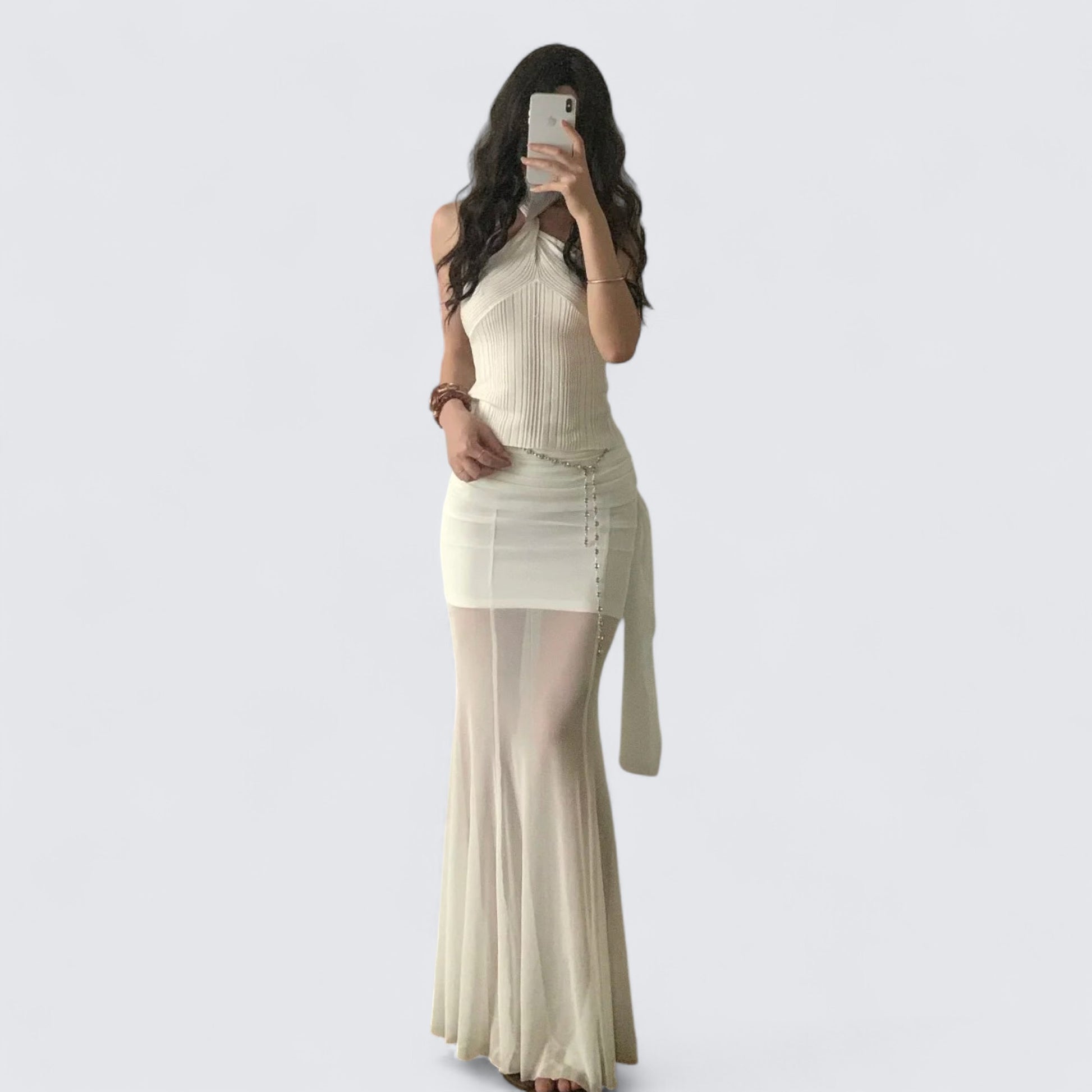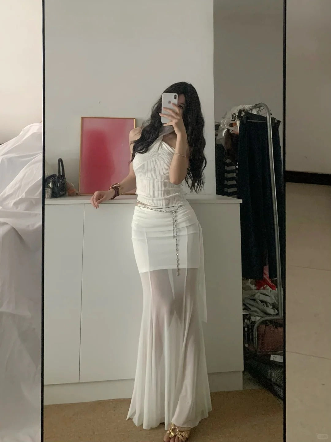 White Halter and White Mesh Skirt Y2K Two Pieces Sets