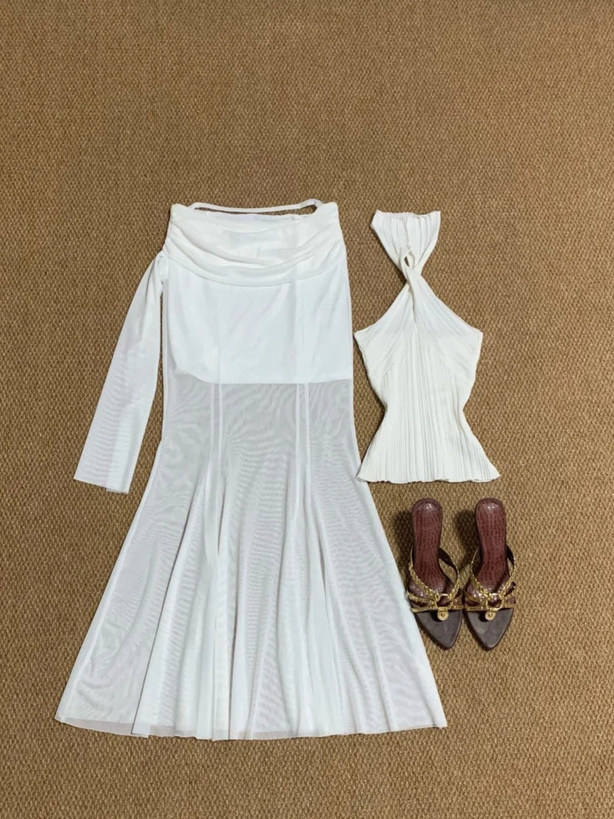 - Bottom: White mesh maxi skirt with layered detail, adding elegance to retro styling.