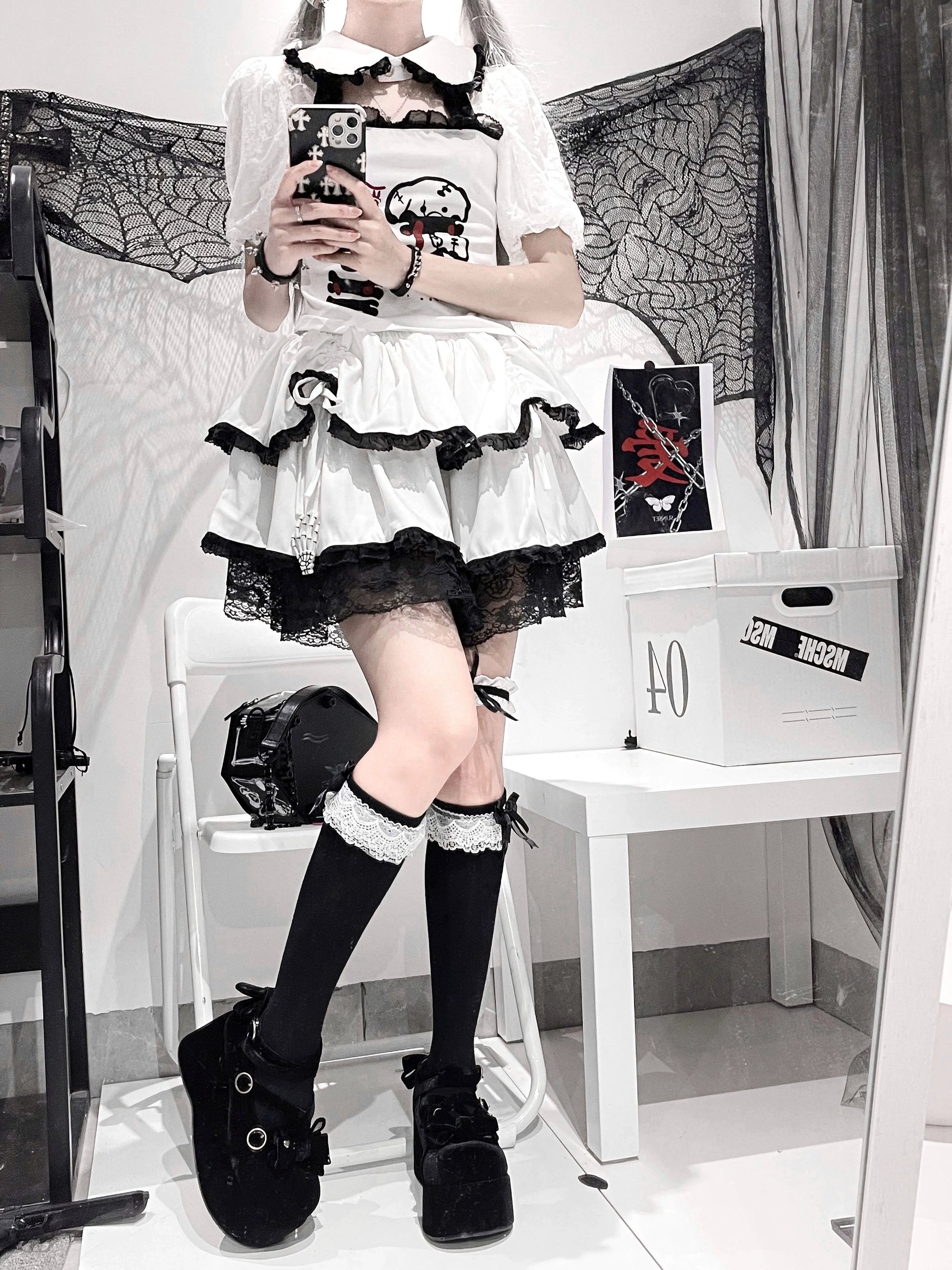 - Skirt: High-waisted fluffy cake skirt with lace details and adjustable tie waist, blending Y2K subculture and niche design. Feminine for all seasons.