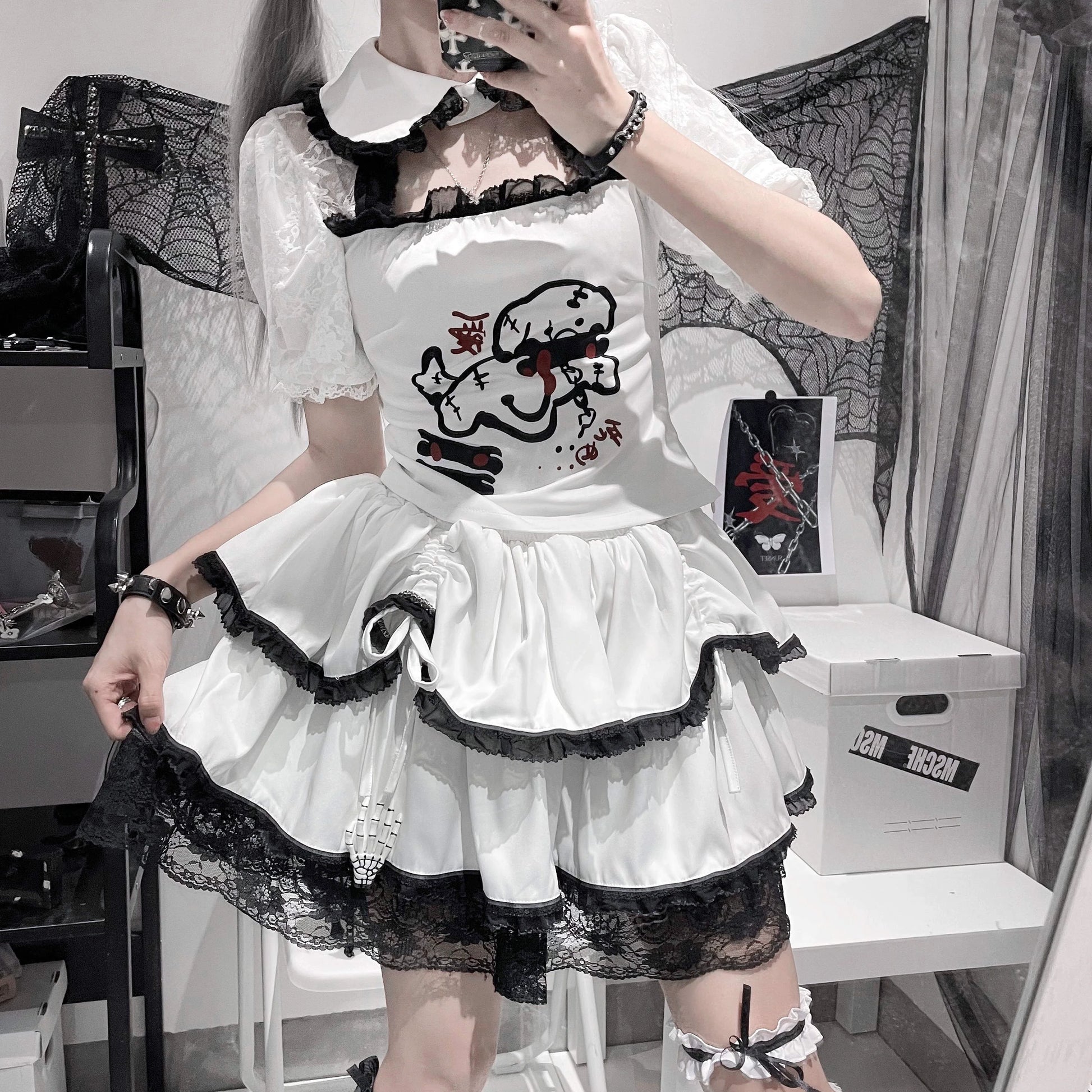 White Subculture Y2K E-girl Lace Cake Skirt Niche Design High-Waisted Tie-Waist Fluffy Skirt
