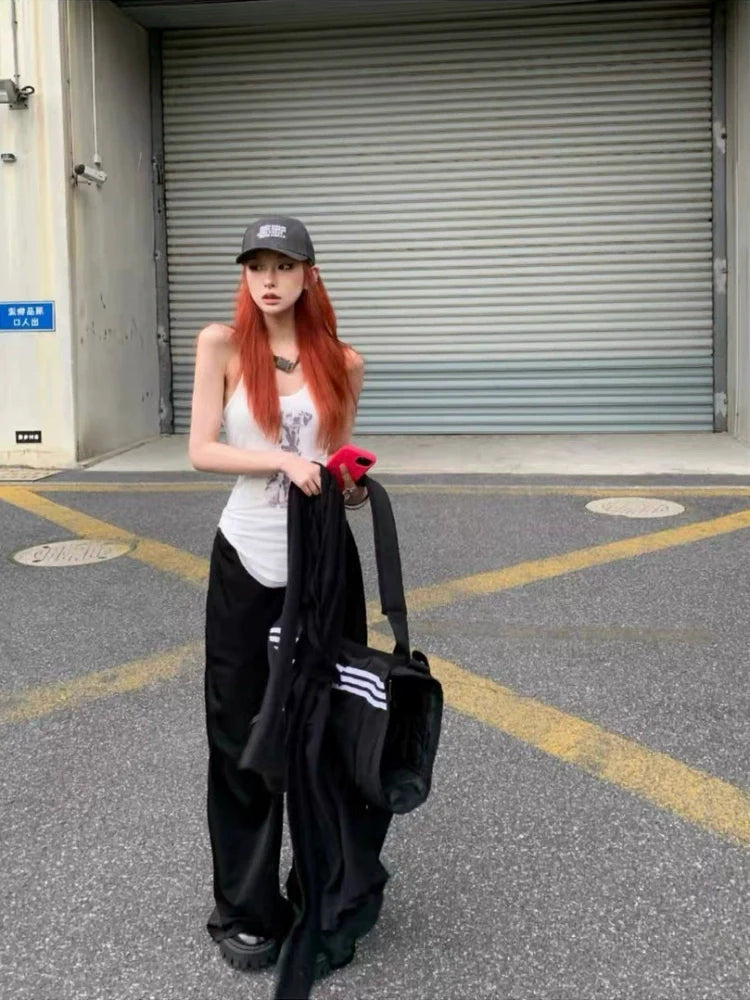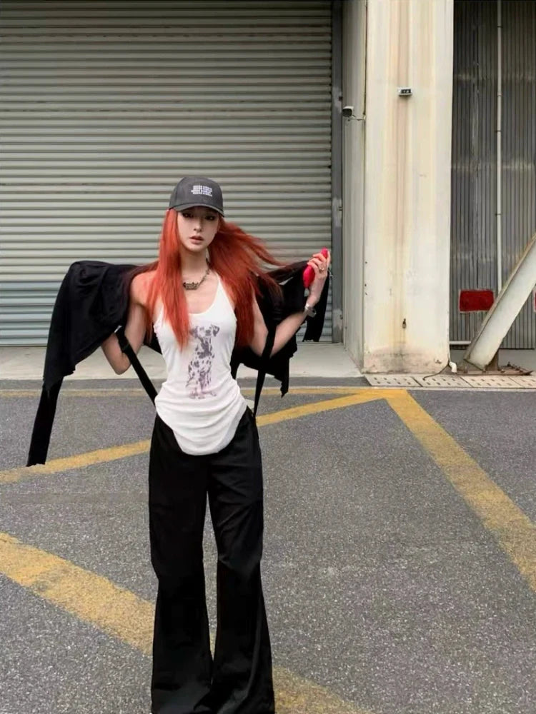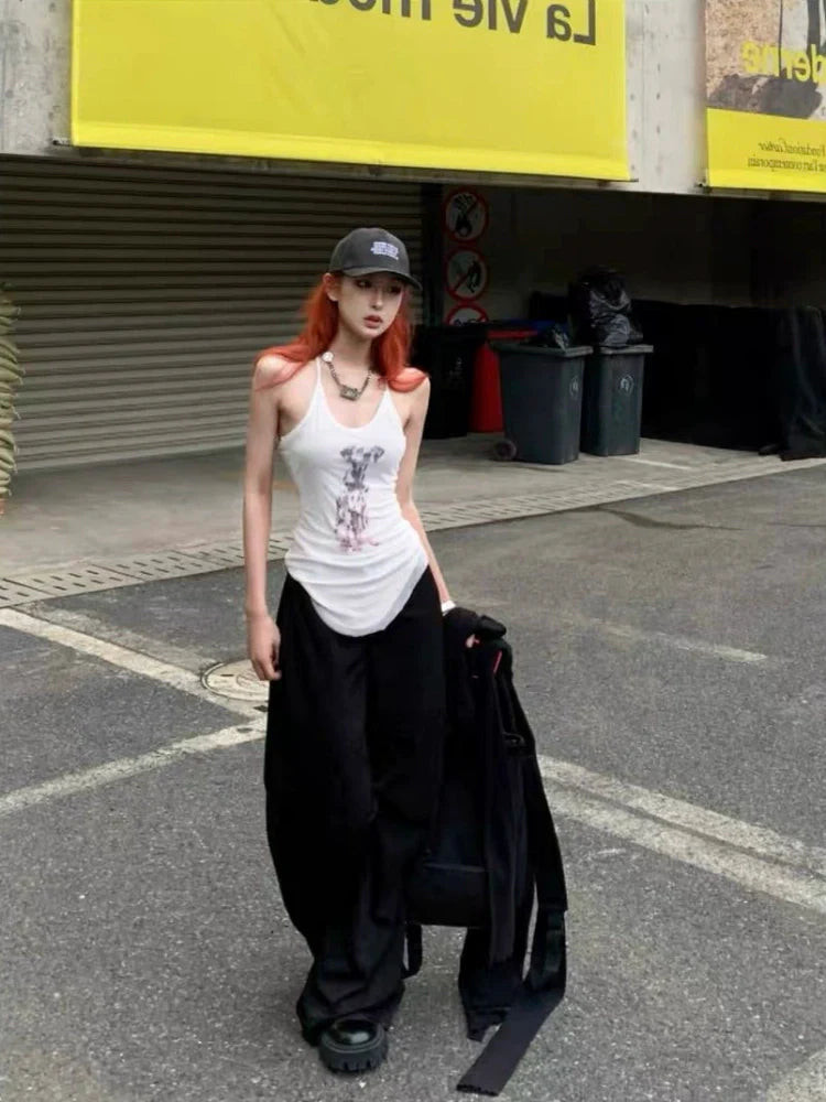 - Tank Top: White sleeveless tank top with Y2K subculture () vibe, featuring mesh fake two-piece design and American retro dog prints—ideal for summer.
