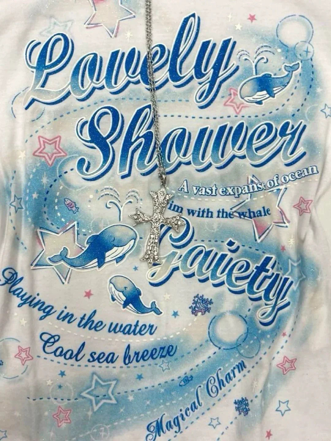 - Top: White short-sleeve tee with vintage-inspired graphic print, capturing Y2K subculture () vibes and retro American casual style for summer.
