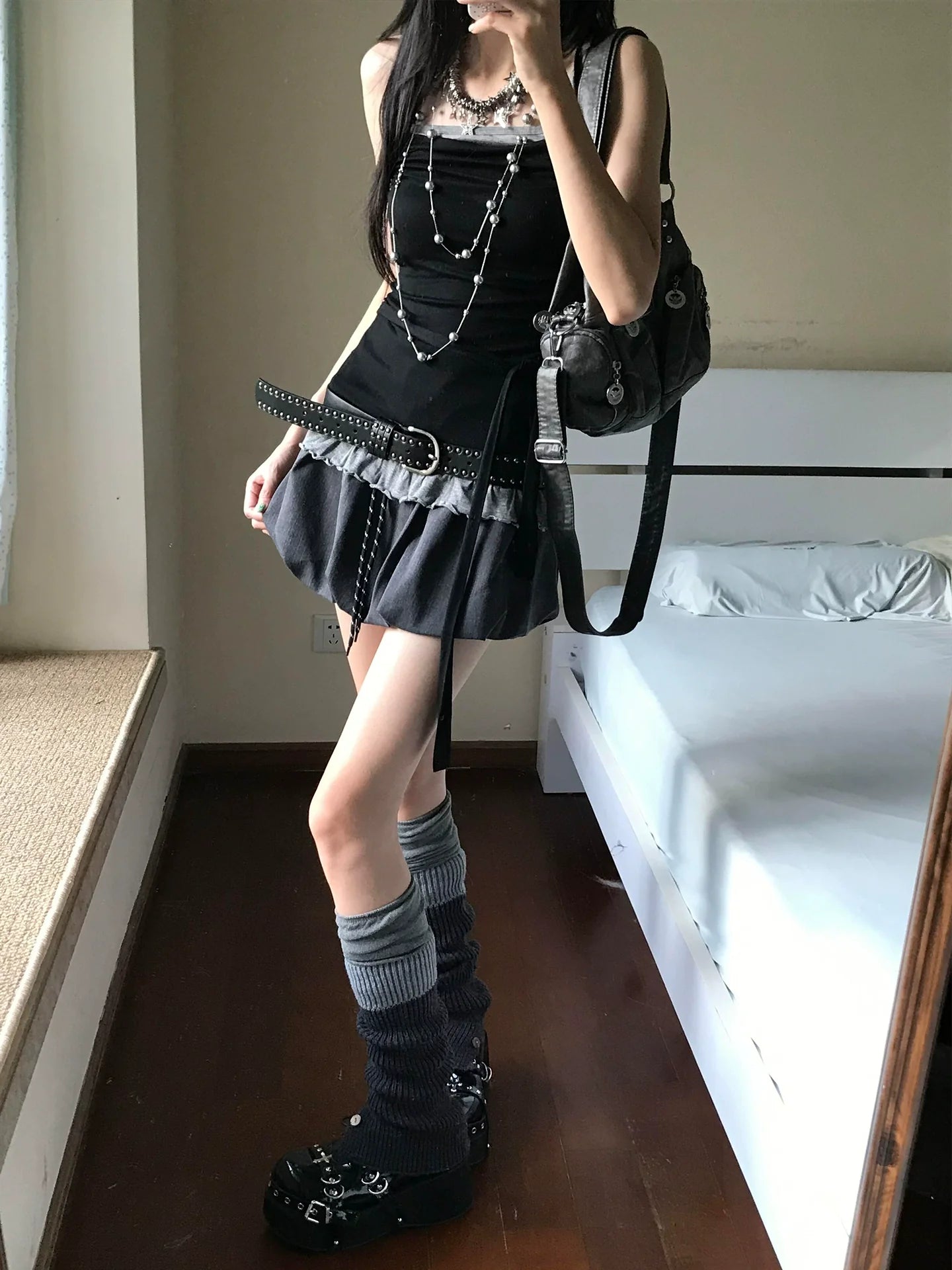 - Top: Y2K-inspired layered cami with lace trims, bow details, and slim fit, perfect for cute summer outfits and streetwear style.