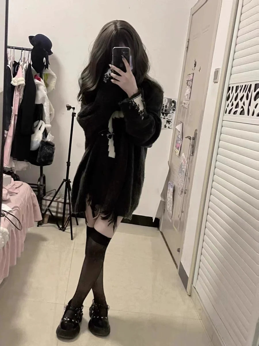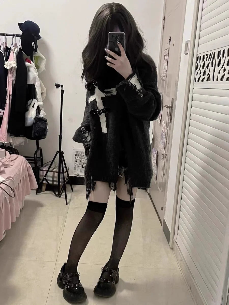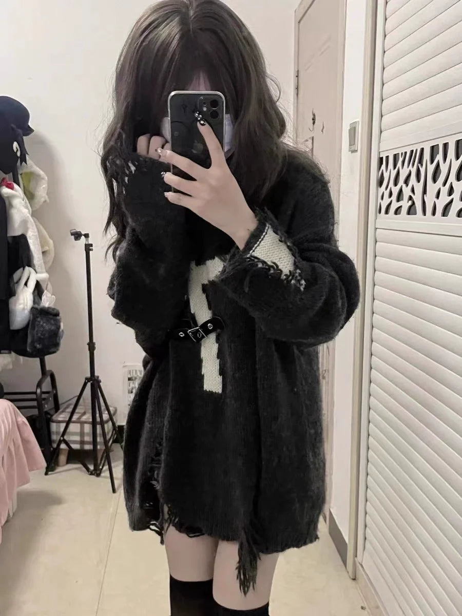 - Sweater: Long-sleeve mid-length sweater with Y2K punk subculture vibe, featuring cross prints and distressed holes—loose lazy fit ideal for autumn/winter.