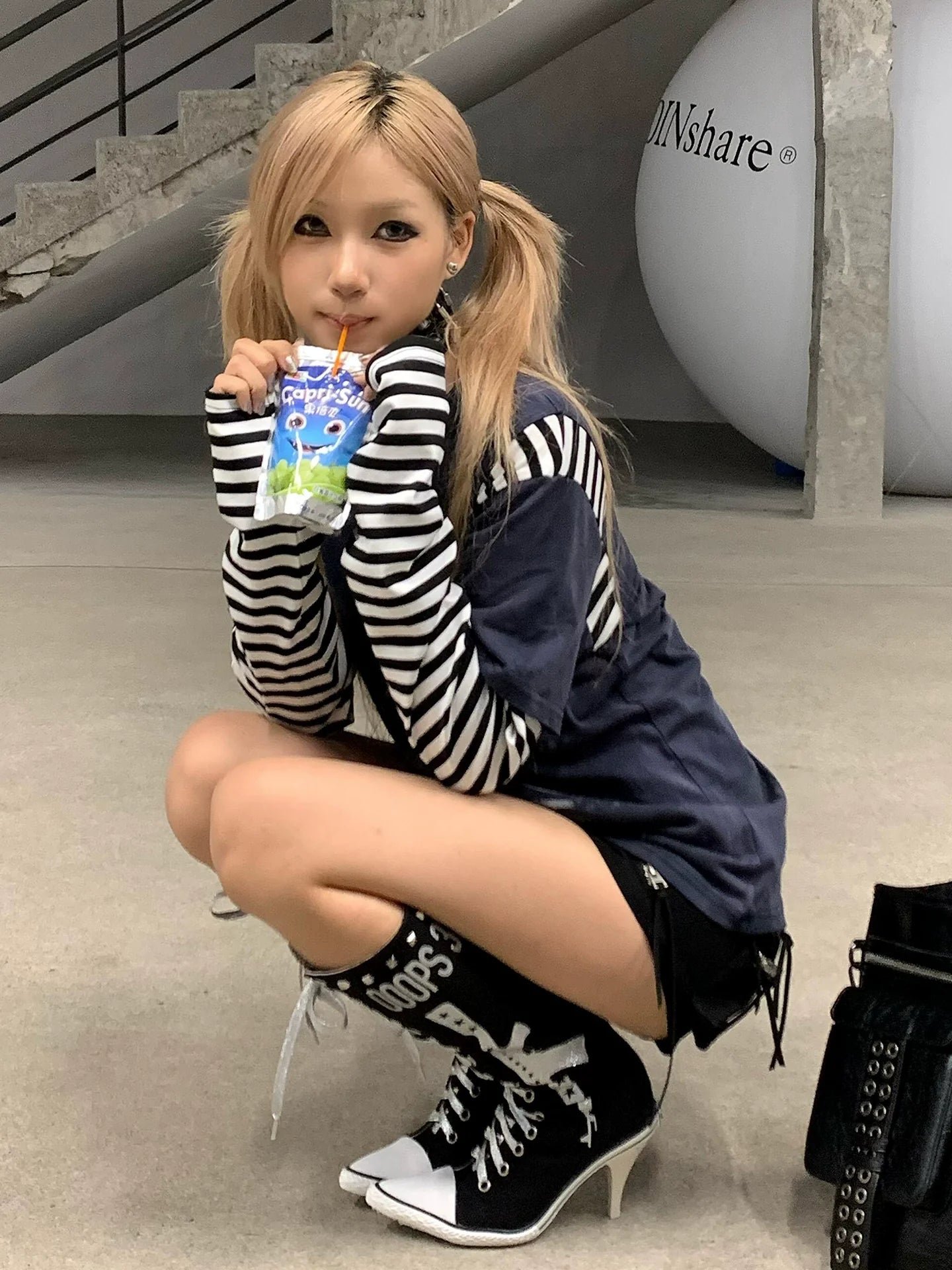 - Top: Y2K-inspired long sleeve t-shirt with dark blue stripes, colorblock panels, faux layered design, lightweight cotton fabric.