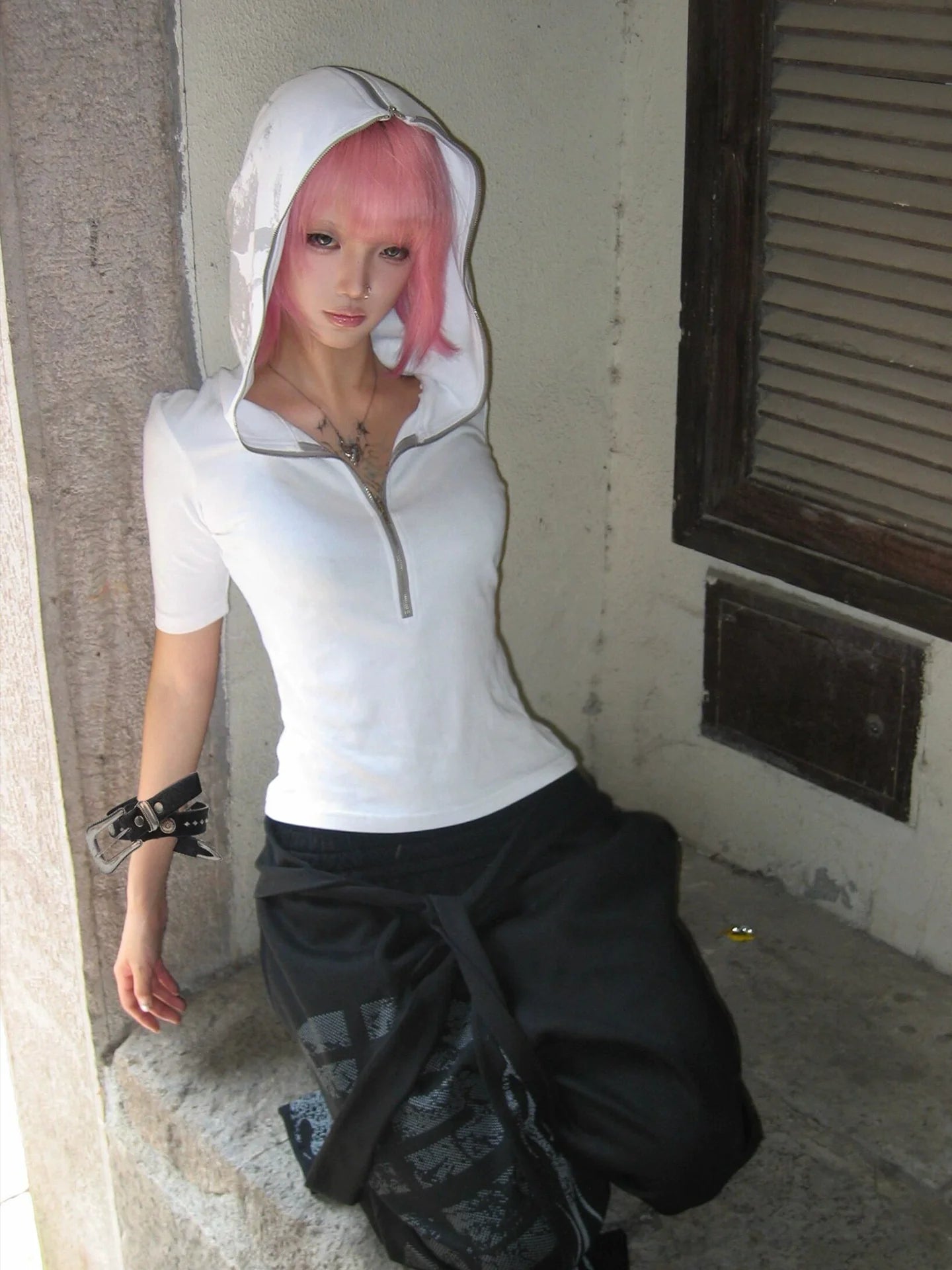 - Top: Hooded short sleeve tee featuring skull boxing print, fitted cut and Y2K subculture punk vibe.