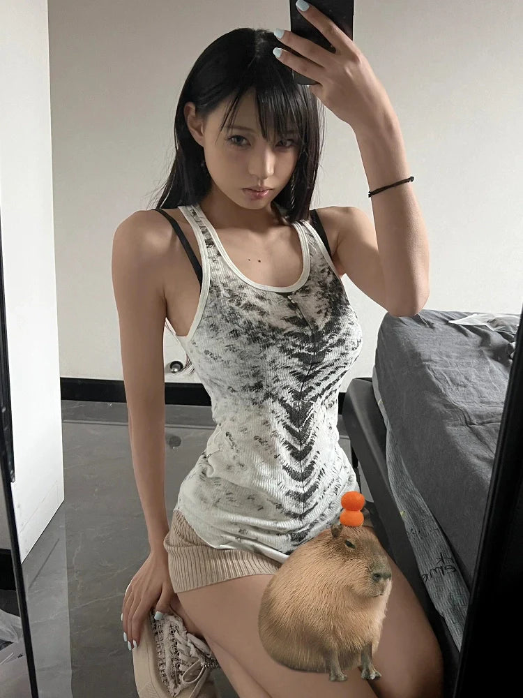 - Top: Sleeveless tank top with fishbone stitching and corset-inspired design, fitted waist for a flattering Y2K silhouette.