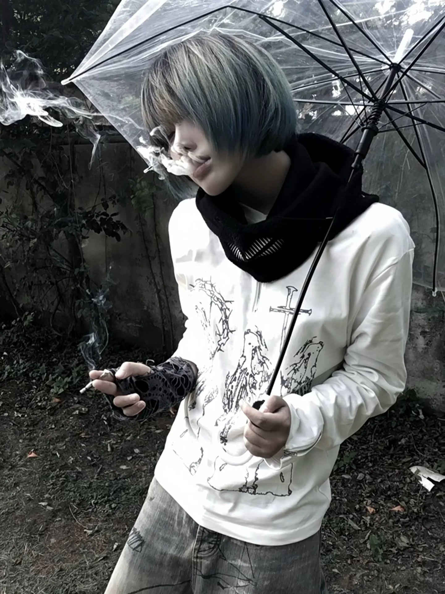 - Top: Autumn heavy-weight Henley long sleeve t-shirt, relaxed fit, white cotton, retro Y2K visual kei shoulder design, half-zip detail.