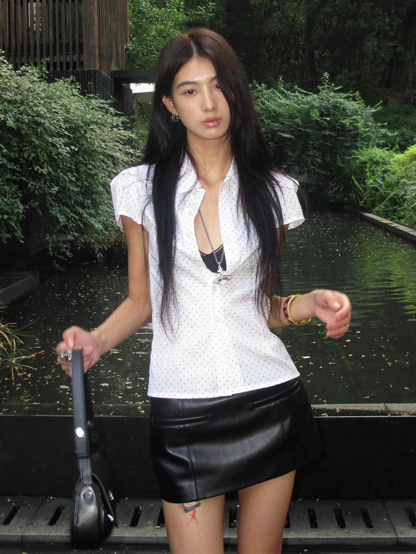 - Top: White short sleeve shirt with polka dot and star print, fitted waist design, structured shoulders, retro Y2K aesthetic with vintage feminine charm.