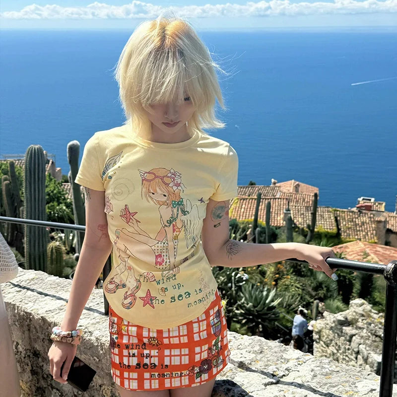 Yellow Anime Print Short Sleeve Tee Summer Slim Fit Y2K Otaku Style Top