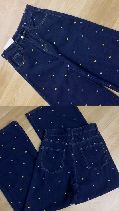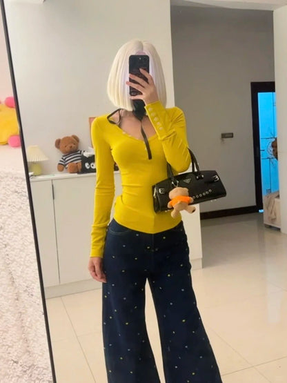 Yellow Button Top with Blue Polka Wide Jeans Y2K Two-Piece Set
