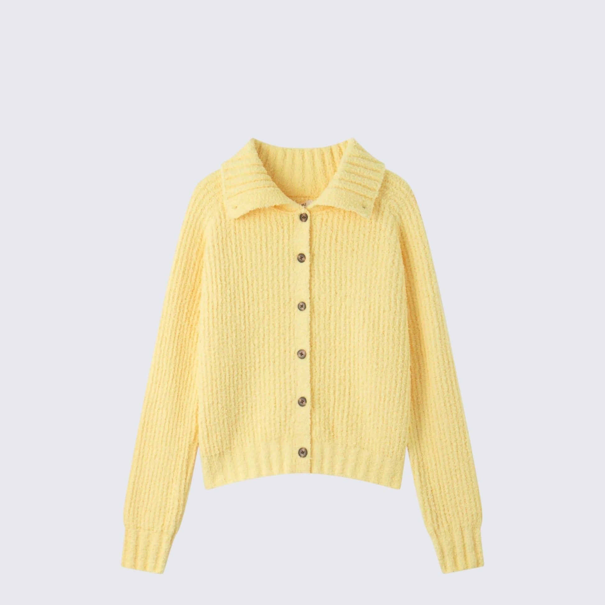 - Cardigan: Loose yellow knit cardigan with collar detail, long sleeves, and soft fabric.