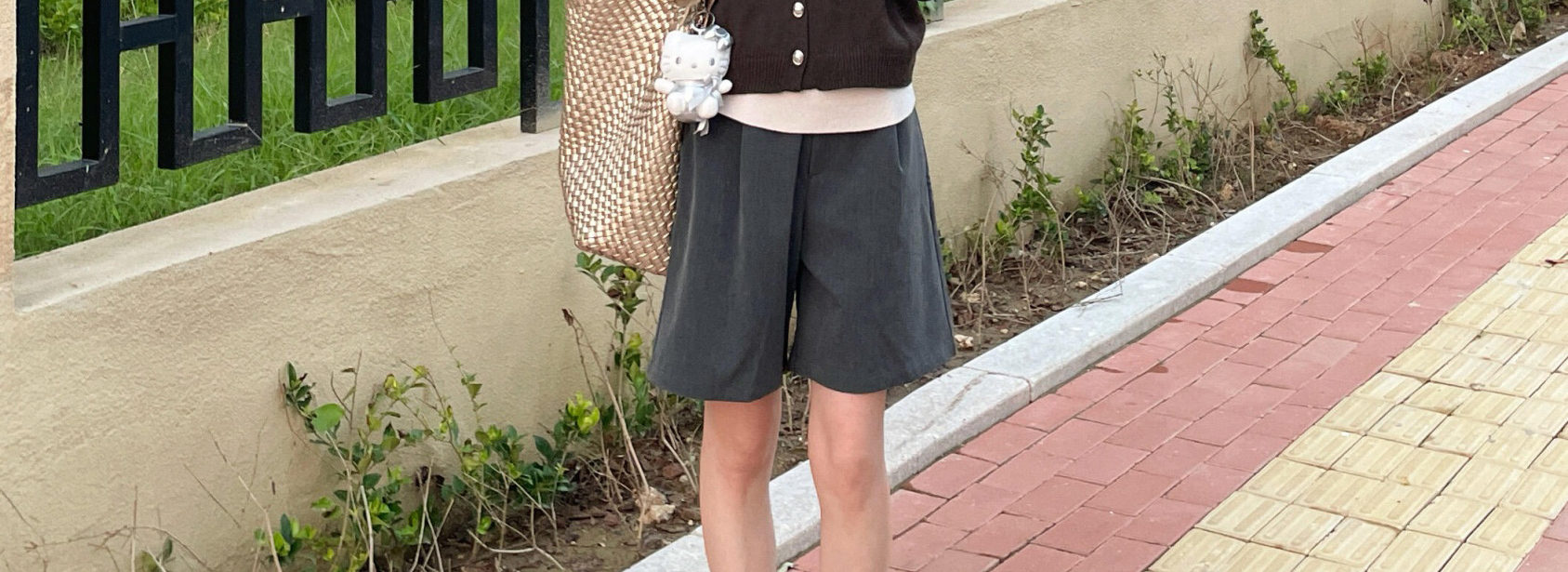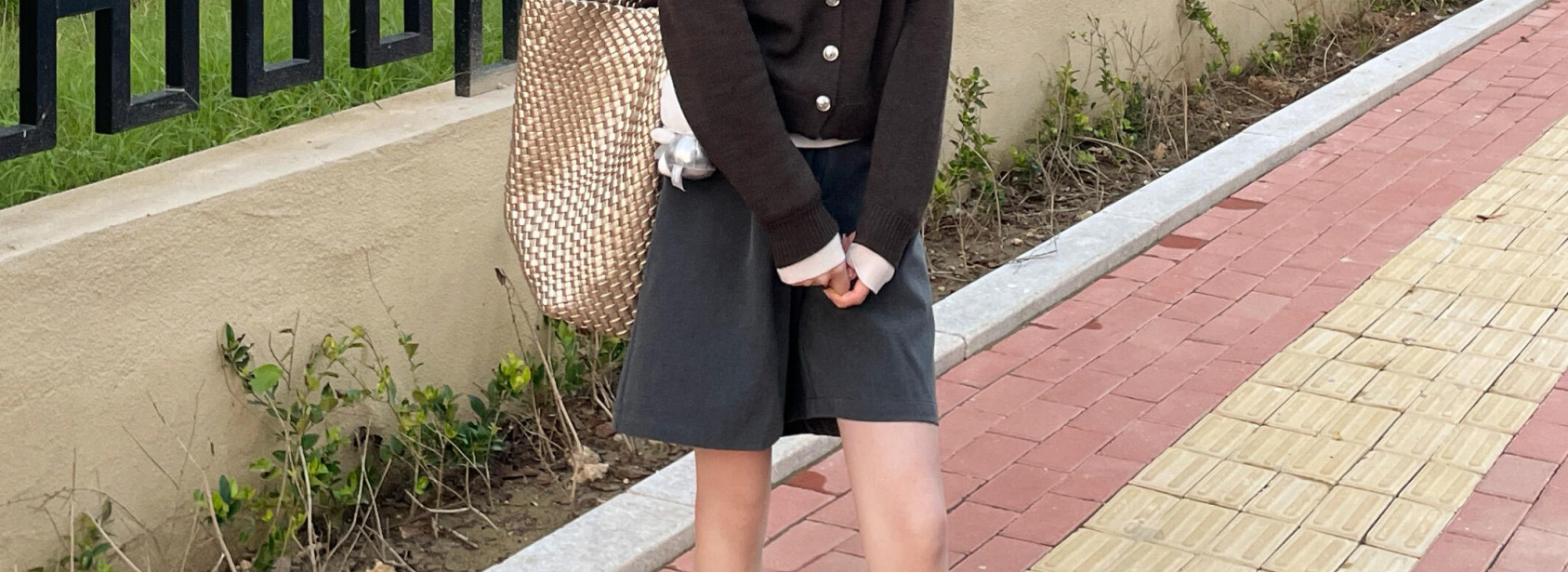 - Top: V-neck knit cardigan with fake two-piece detail and buttons.