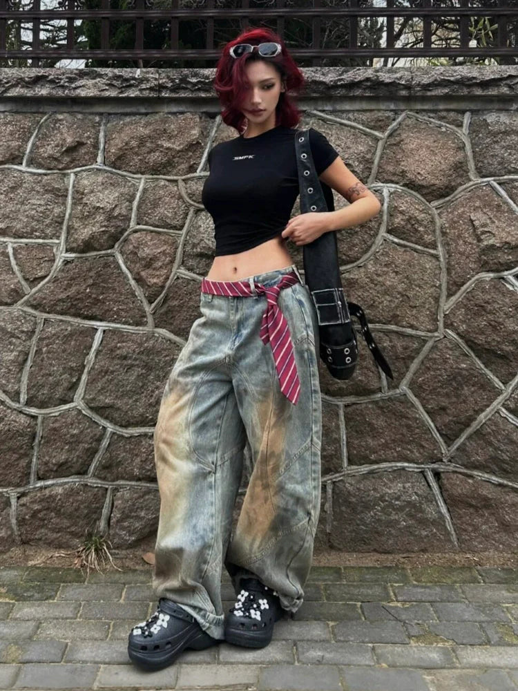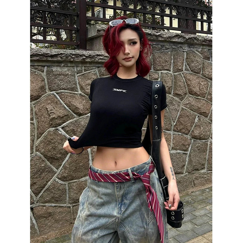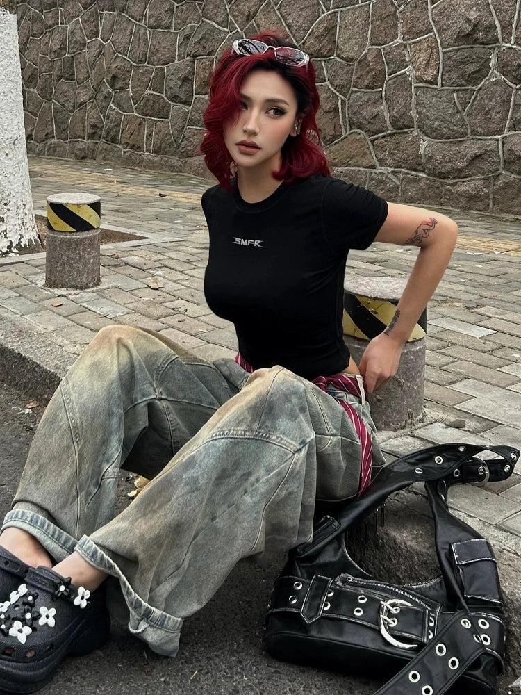 - Top: Premium 40s cotton short sleeve tee, elastic slim fit, structured shoulders, soft and breathable fabric, Y2K-inspired American streetwear look.