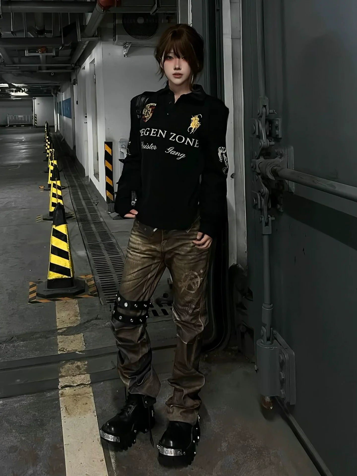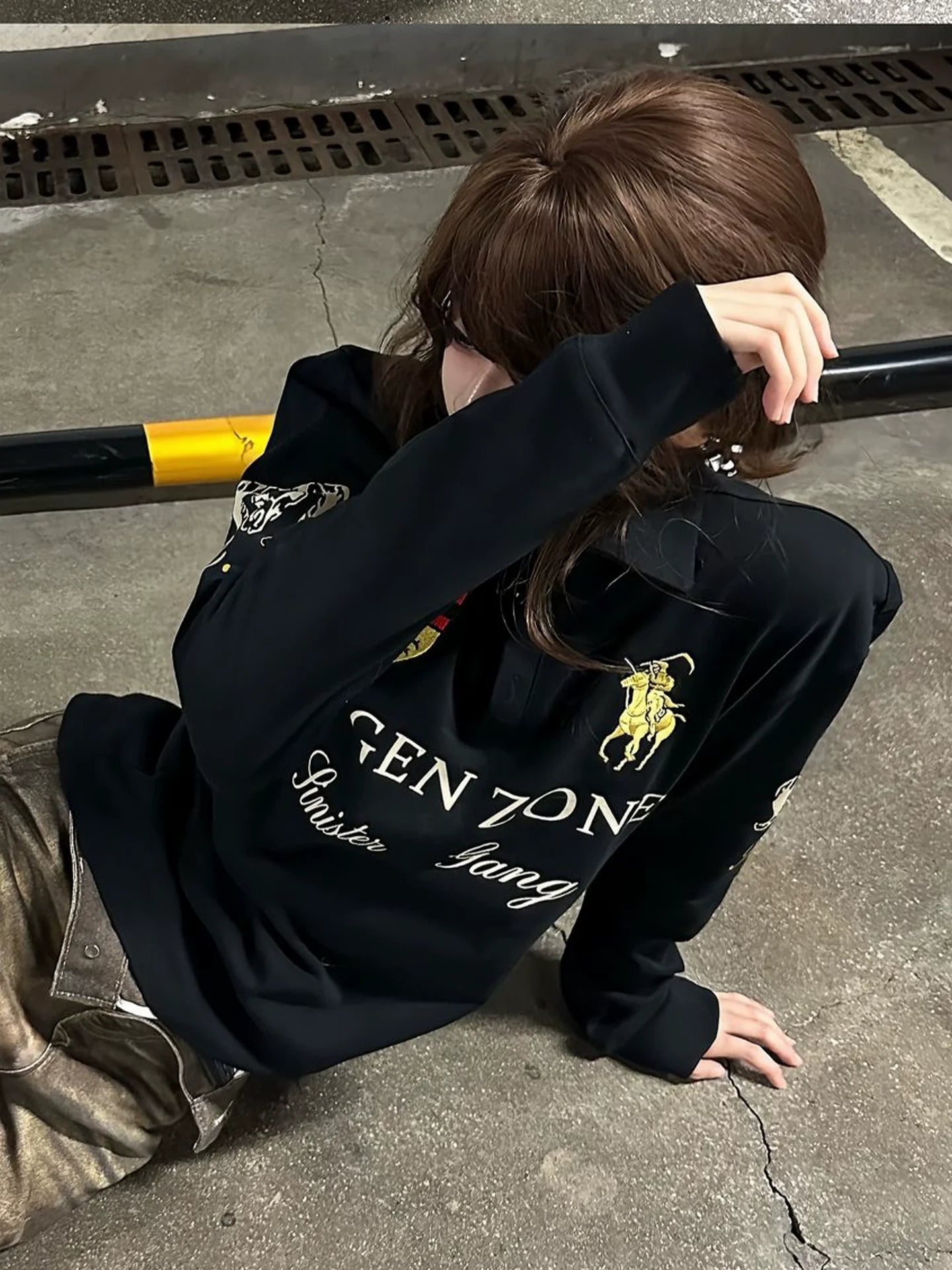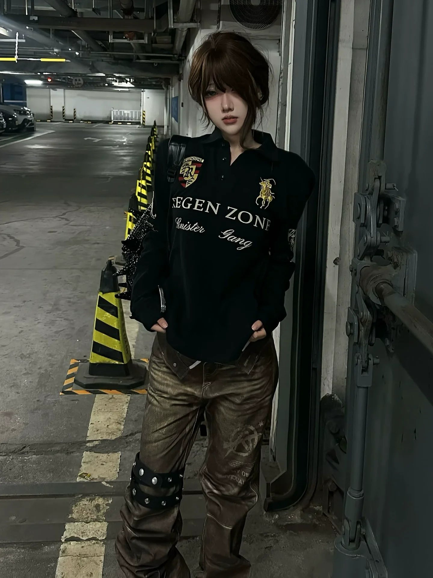 - Top: Autumn long sleeve tee with gold embroidery, fitted waist, black cotton fabric, retro American Y2K aesthetic, polo-inspired style.