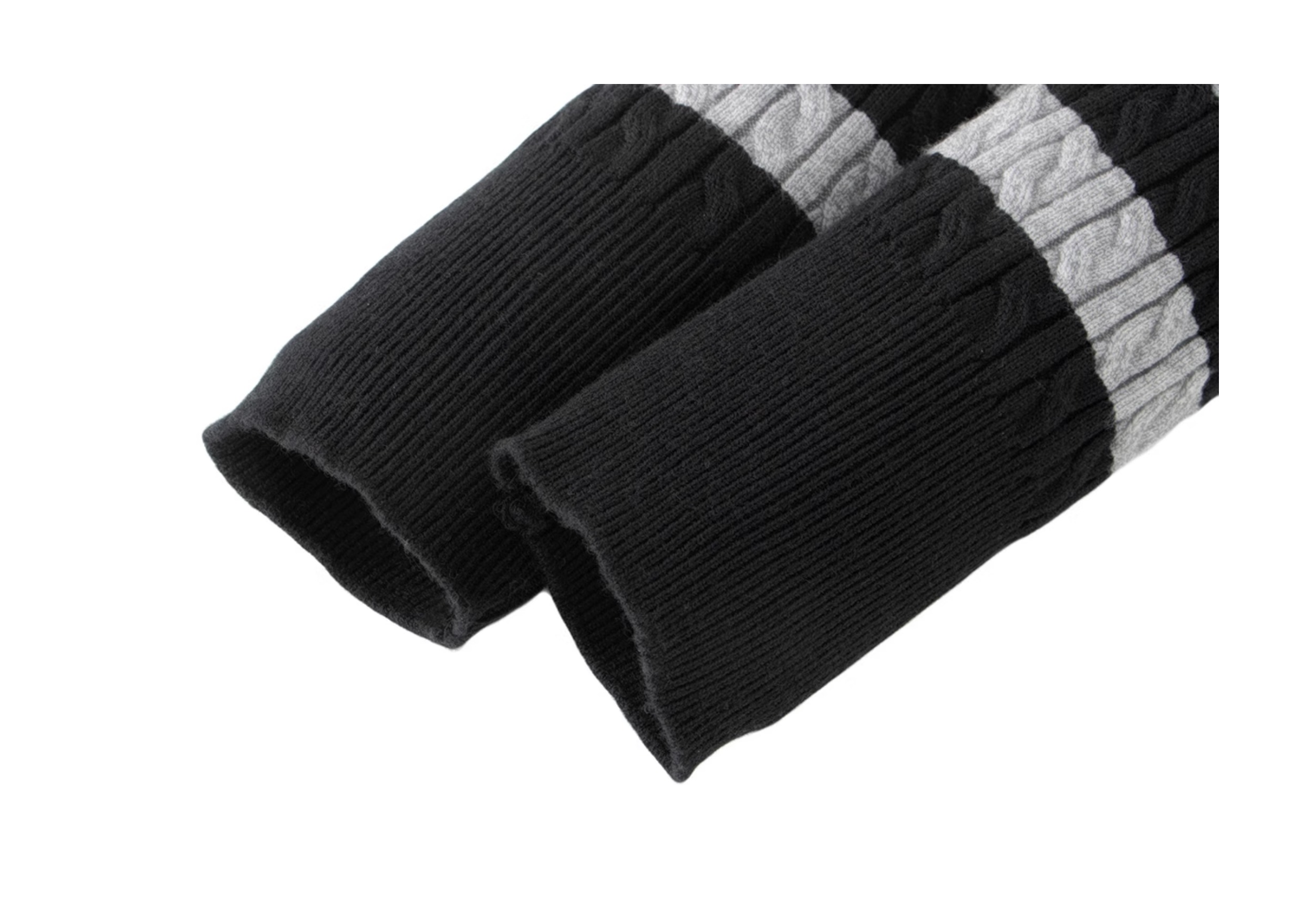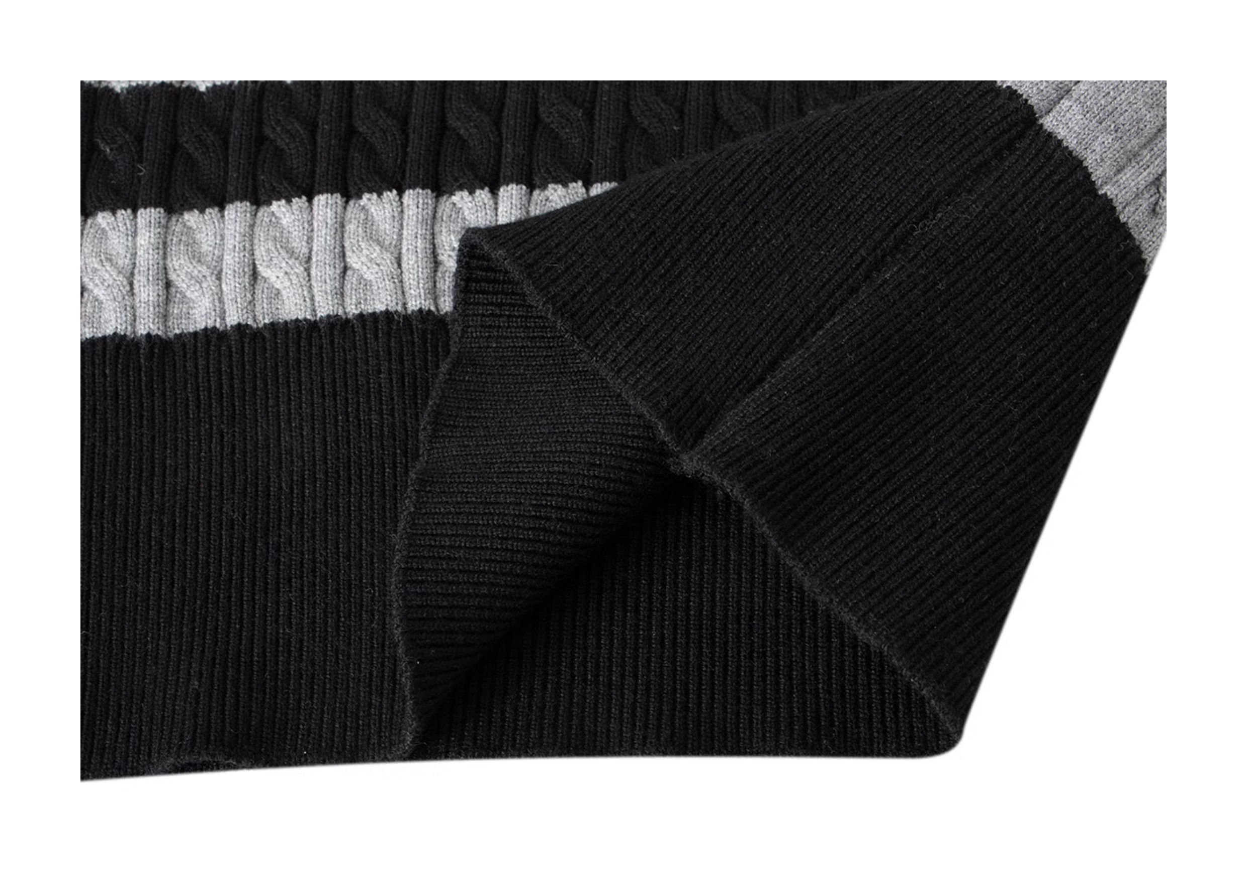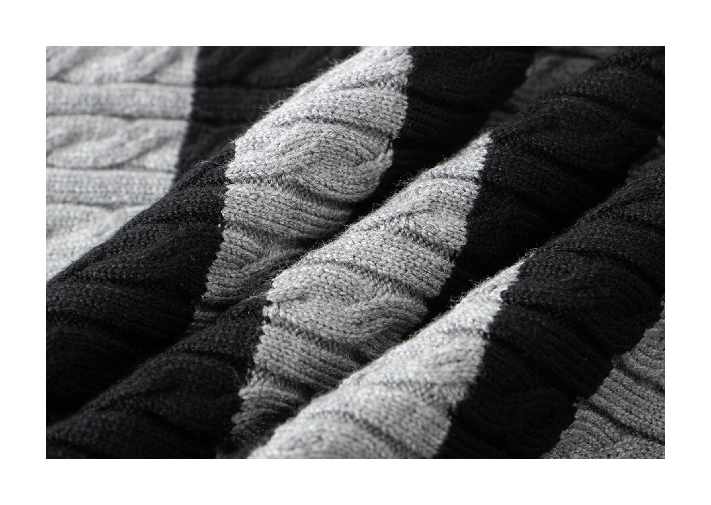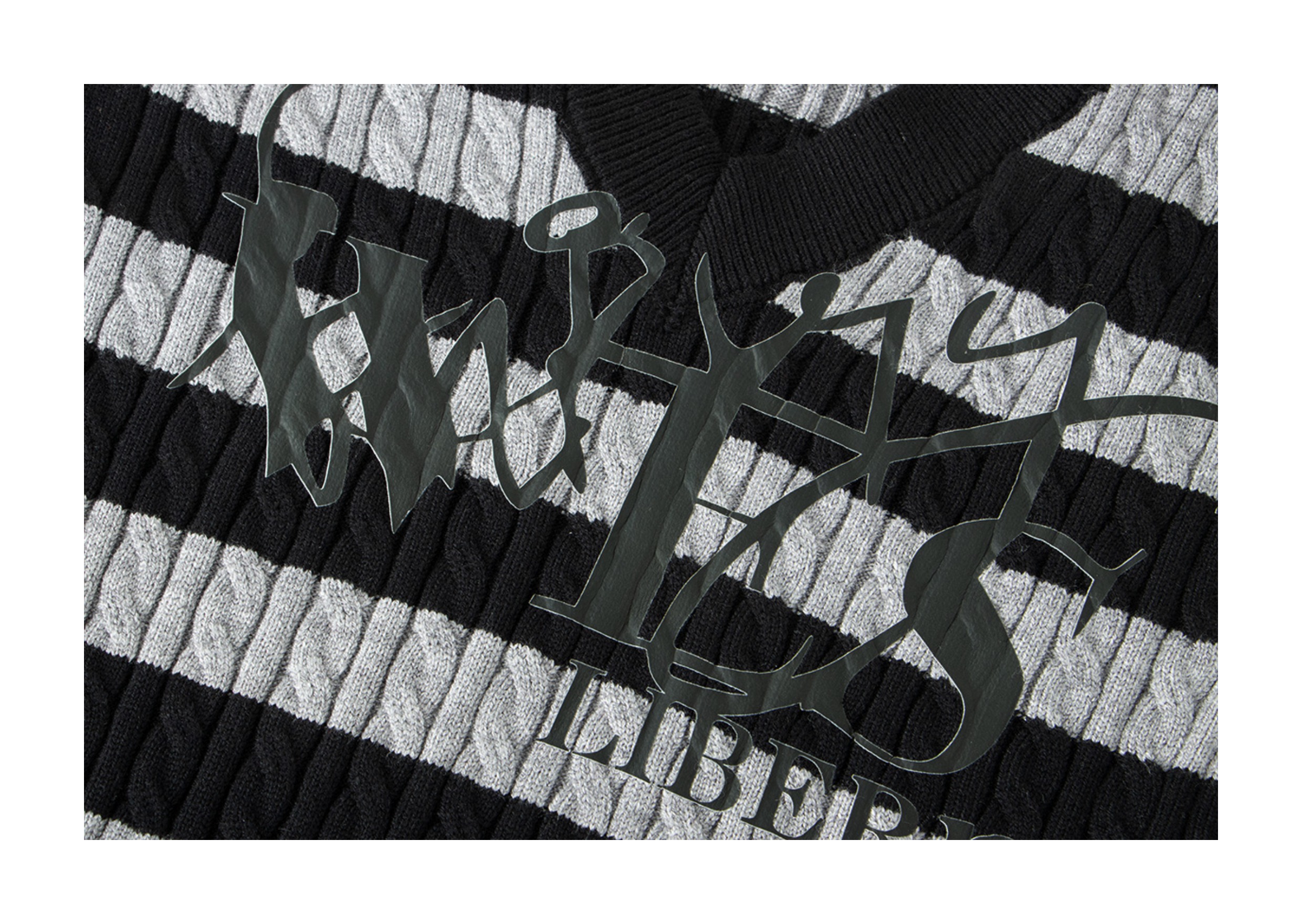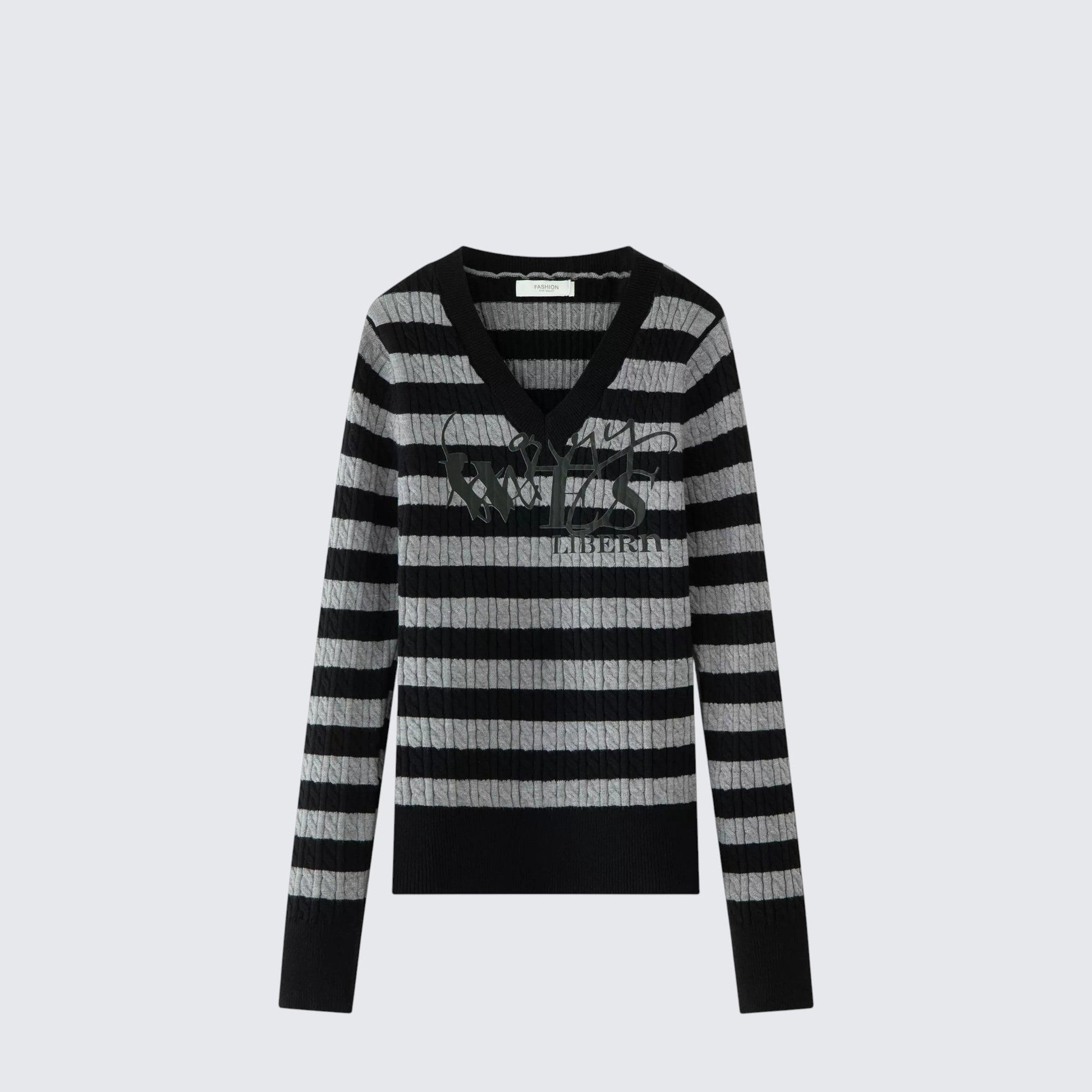 - Top: Slim-fit striped cable knit sweater with V-neck, stretchy fabric perfect for spring.