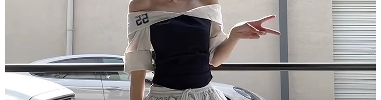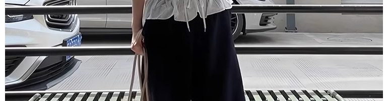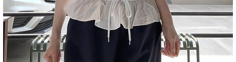 - Top: Off-shoulder top with ruffle detailing paired with matching high-waist pants, soft summer fabric.