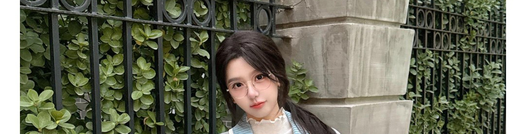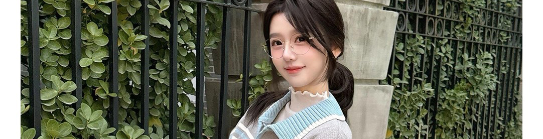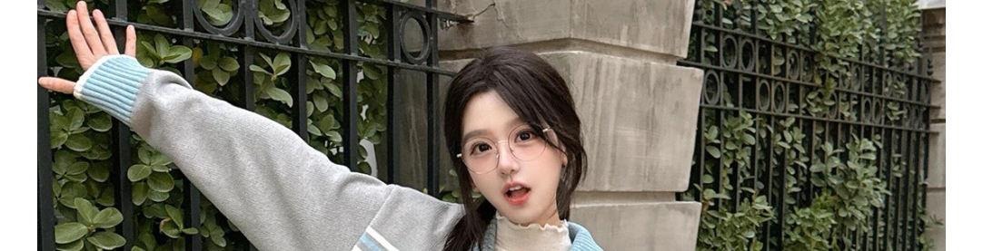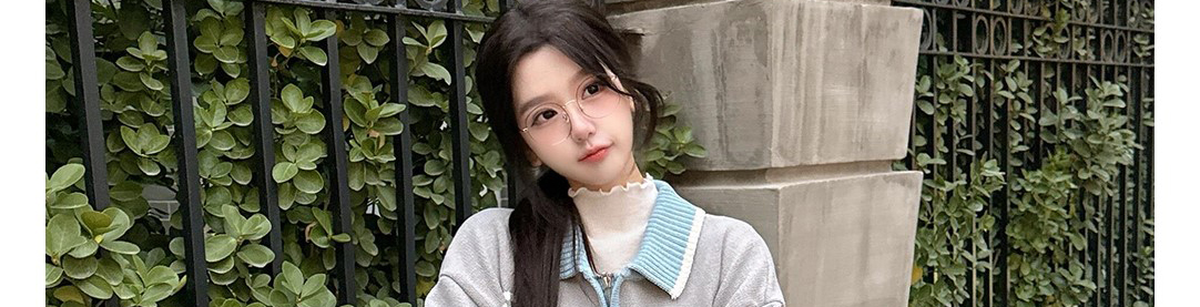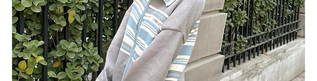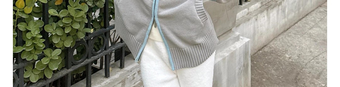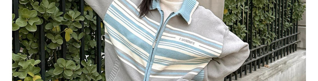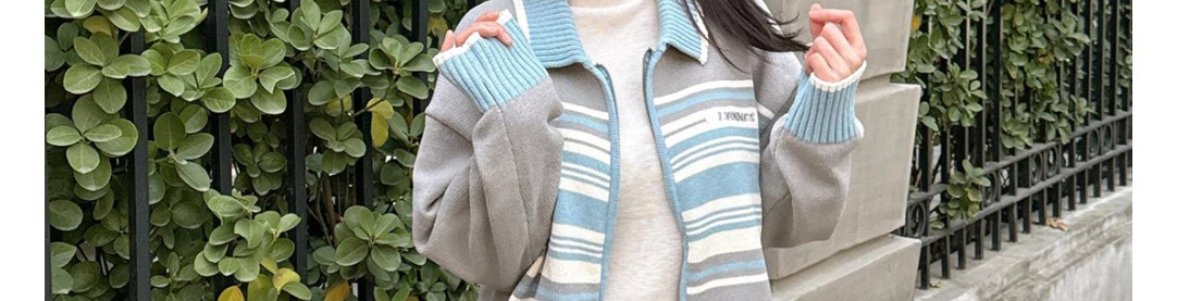 - Top: Stripe knit cardigan with contrast collar and zip closure.