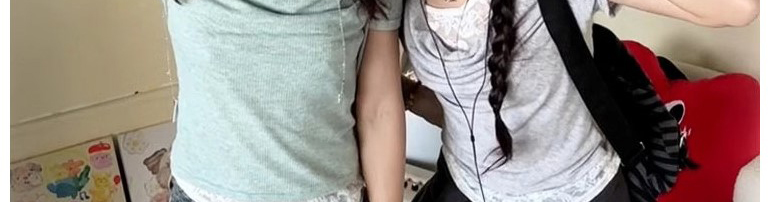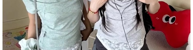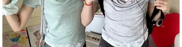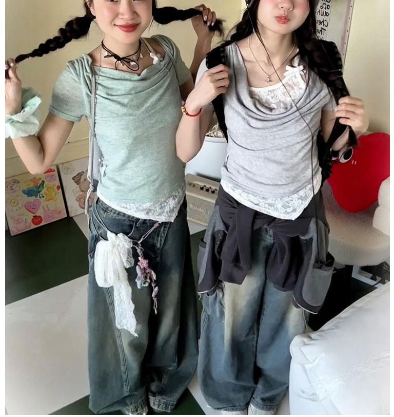 - Top: Slim-fit short sleeve tee with lace patchwork and faux two-piece design, soft summer fabric.