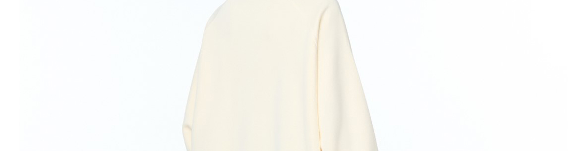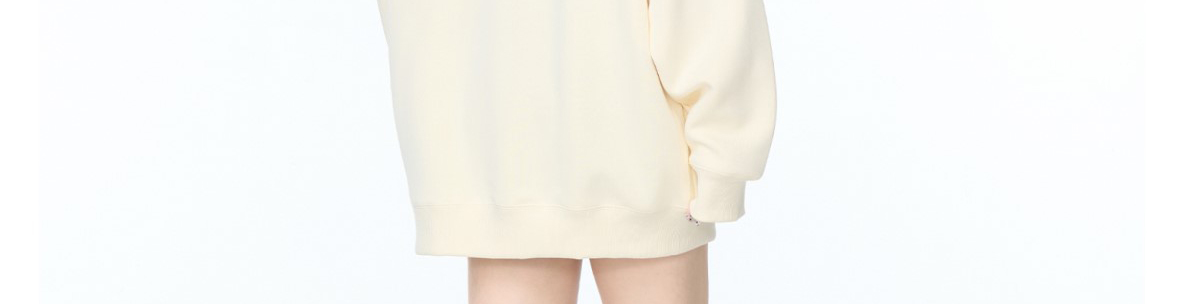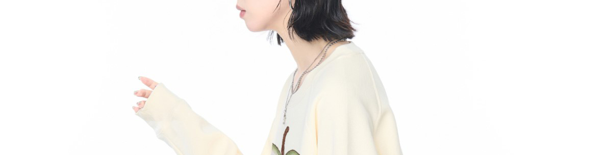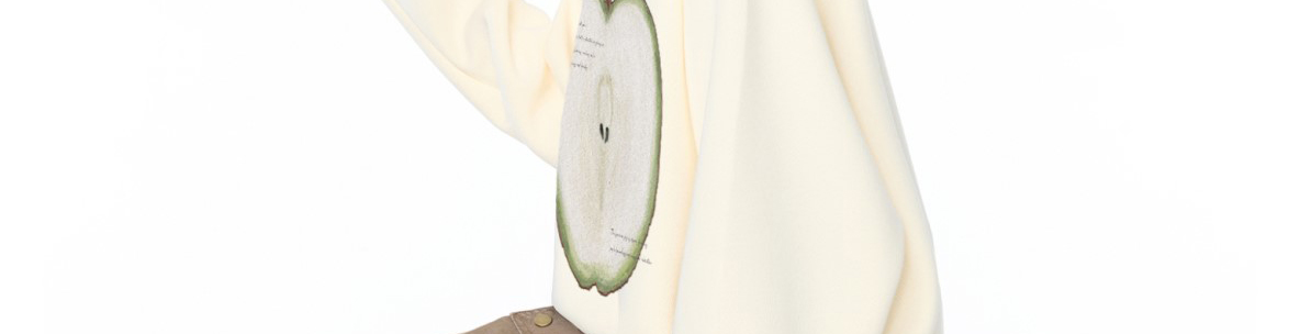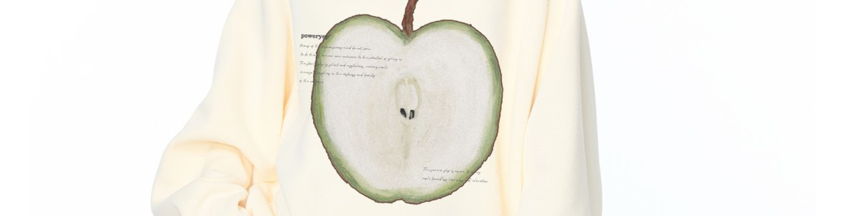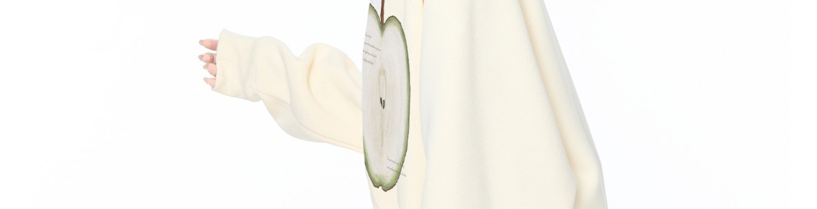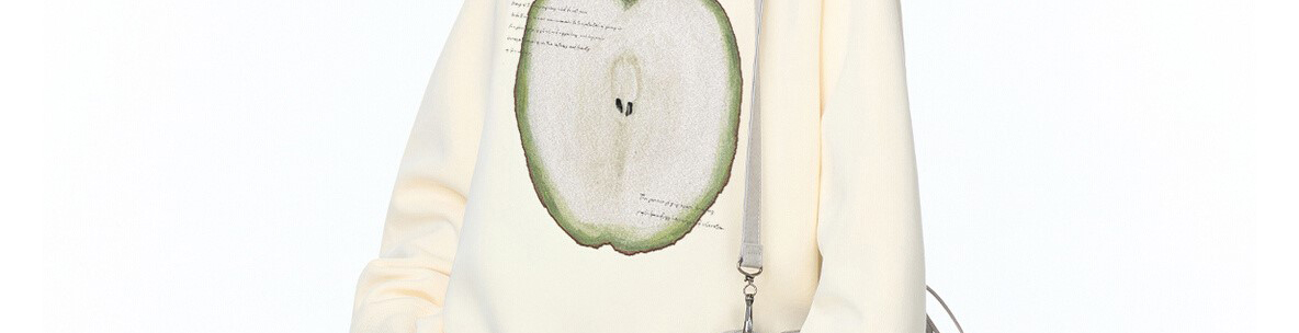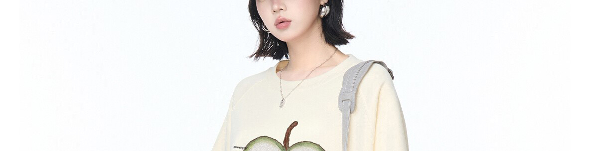 - Top: Oversized long-sleeve sweatshirt with fruit print, soft autumn fabric, heavy and cozy feel.