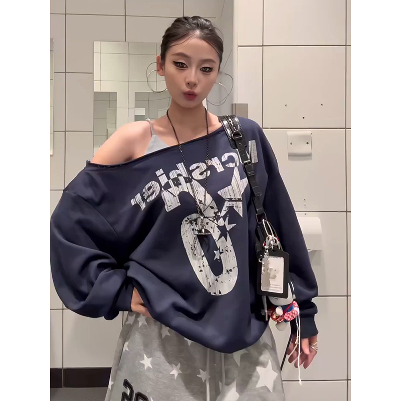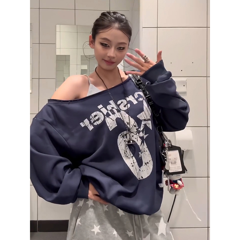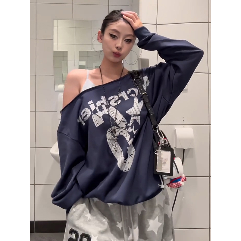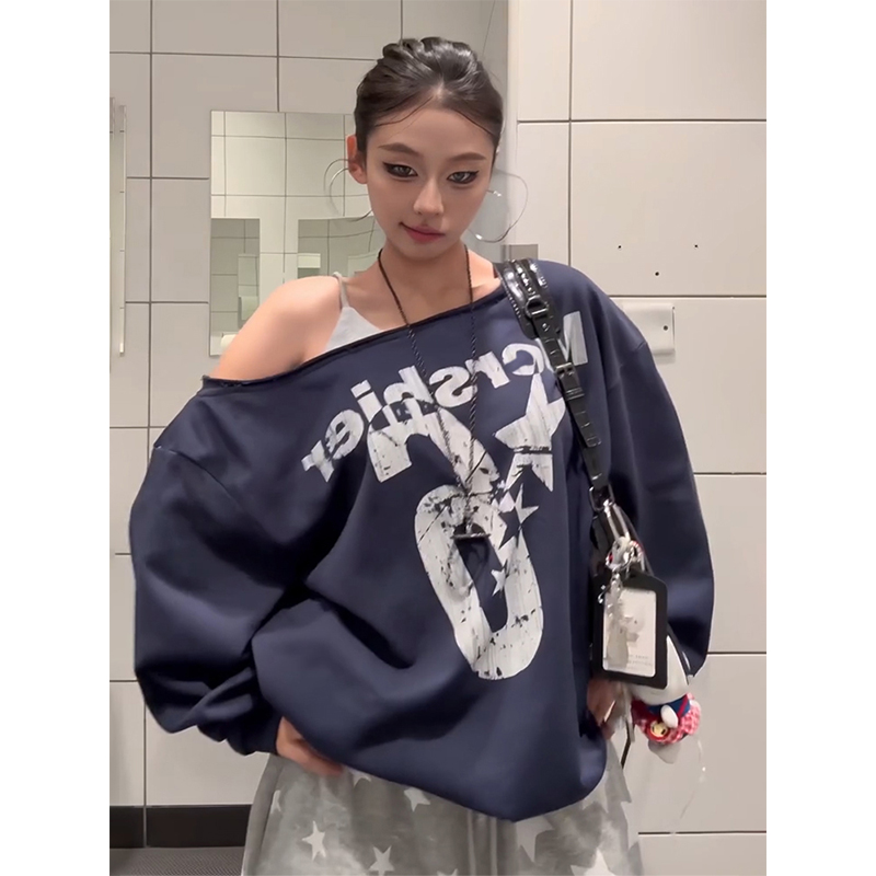 - Top: Oversized autumn hoodie with asymmetrical shoulder, letter print, and faux two-piece design, soft fabric.